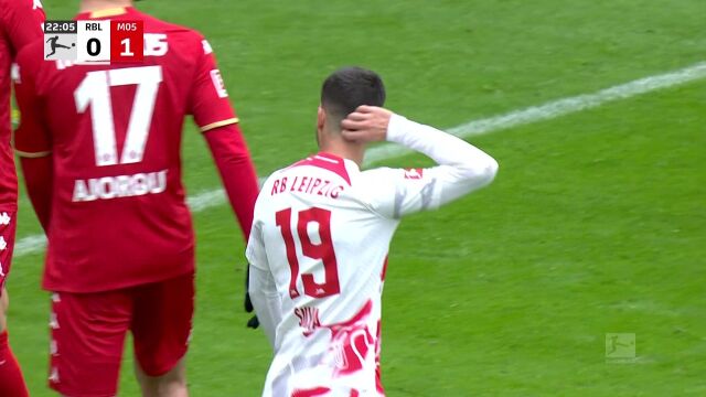 上半场补时到了第5分钟,也就是45+5分钟的时候,美因茨在前场发动进攻。一个角球开出来,或者是一脚传中打到禁区里头,反正场面一度非常混乱。皮球在莱比锡禁区里蹦蹦跳跳的,莱比锡防守队员急于解围,混乱之中胳膊好像碰到了皮球。一开始裁判还没啥表示,示意比赛继续。但美因茨那帮老油条能罢休吗?阿米里第一个冲上去,对着裁判就喊“手球!手球!”-3