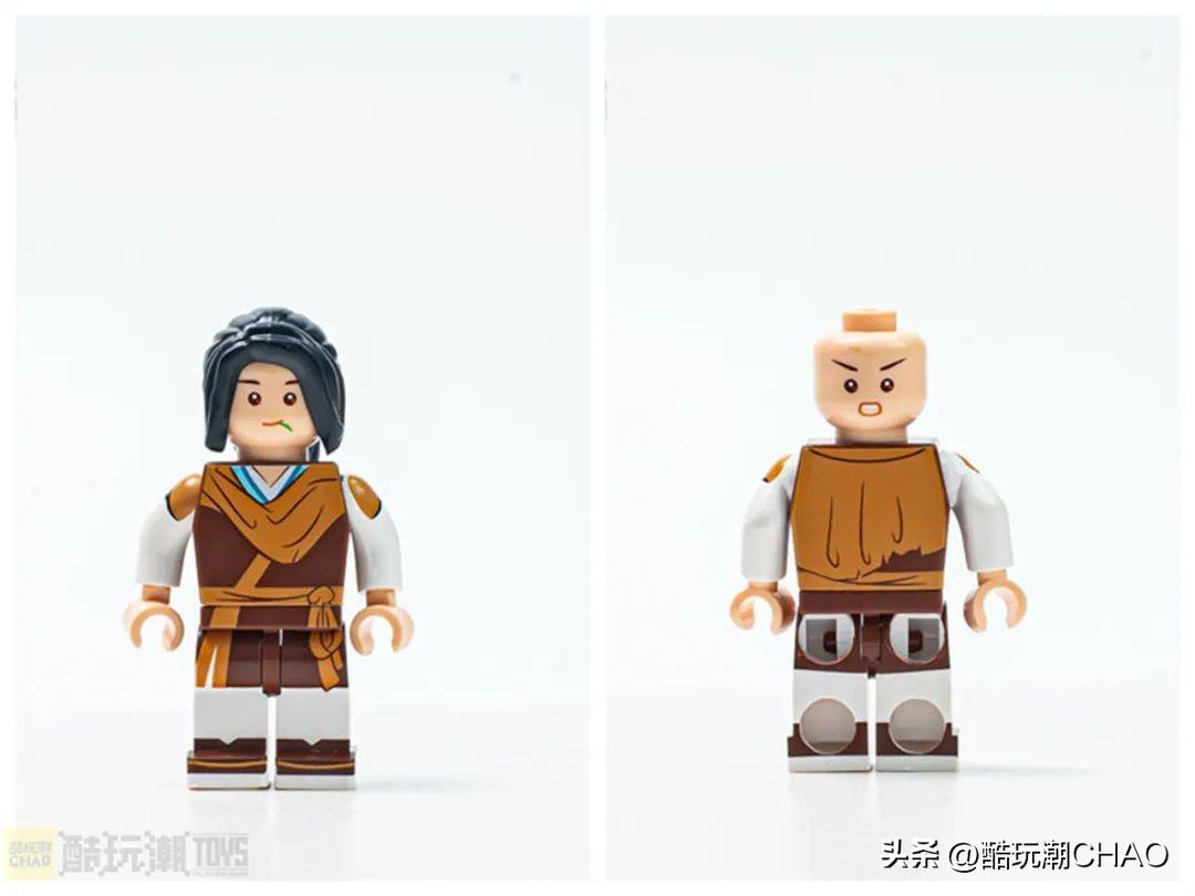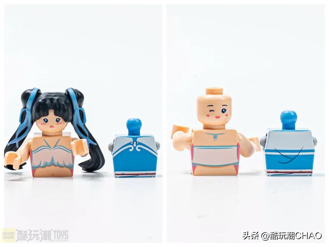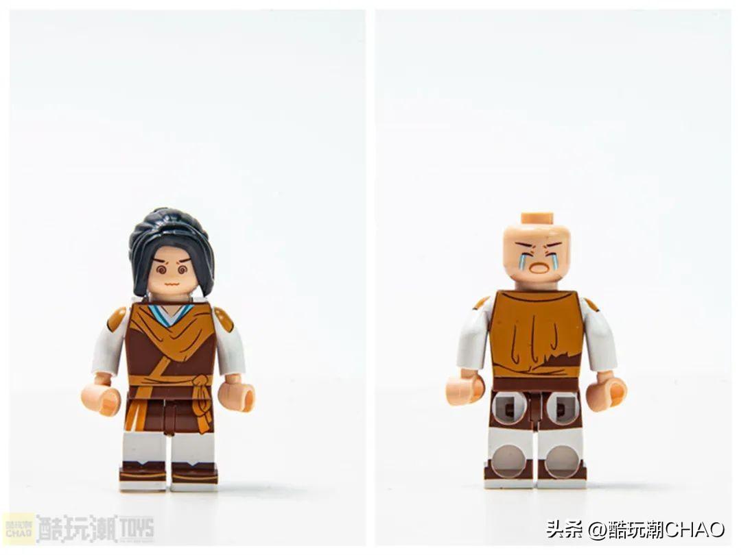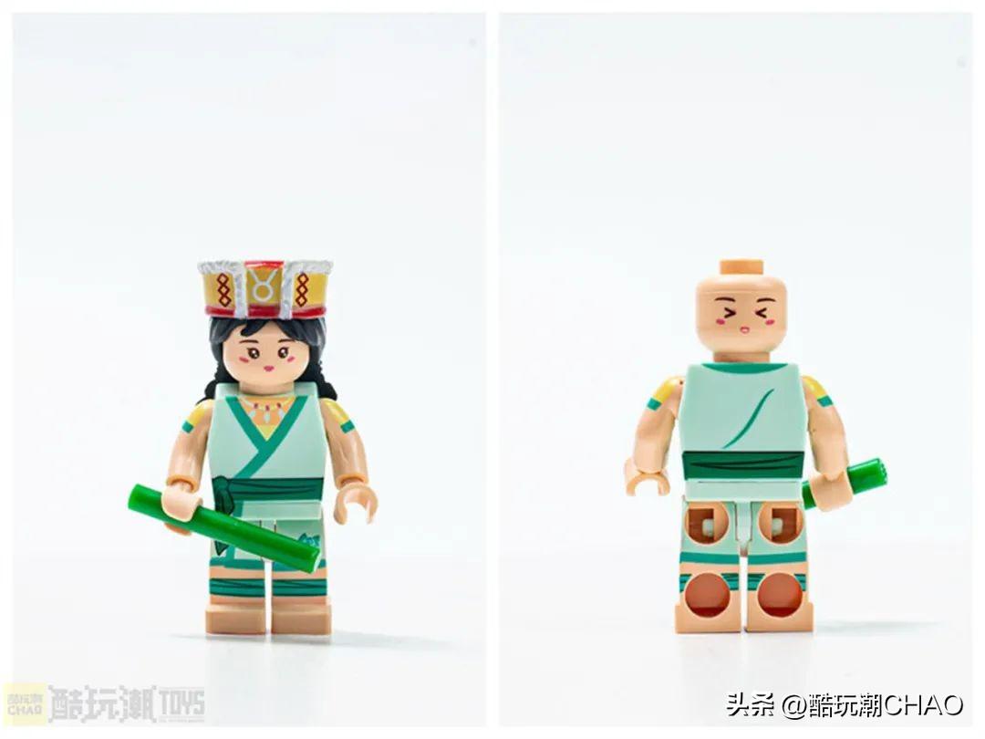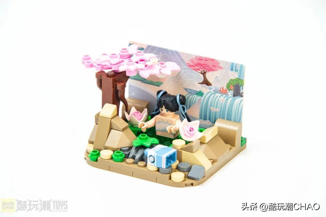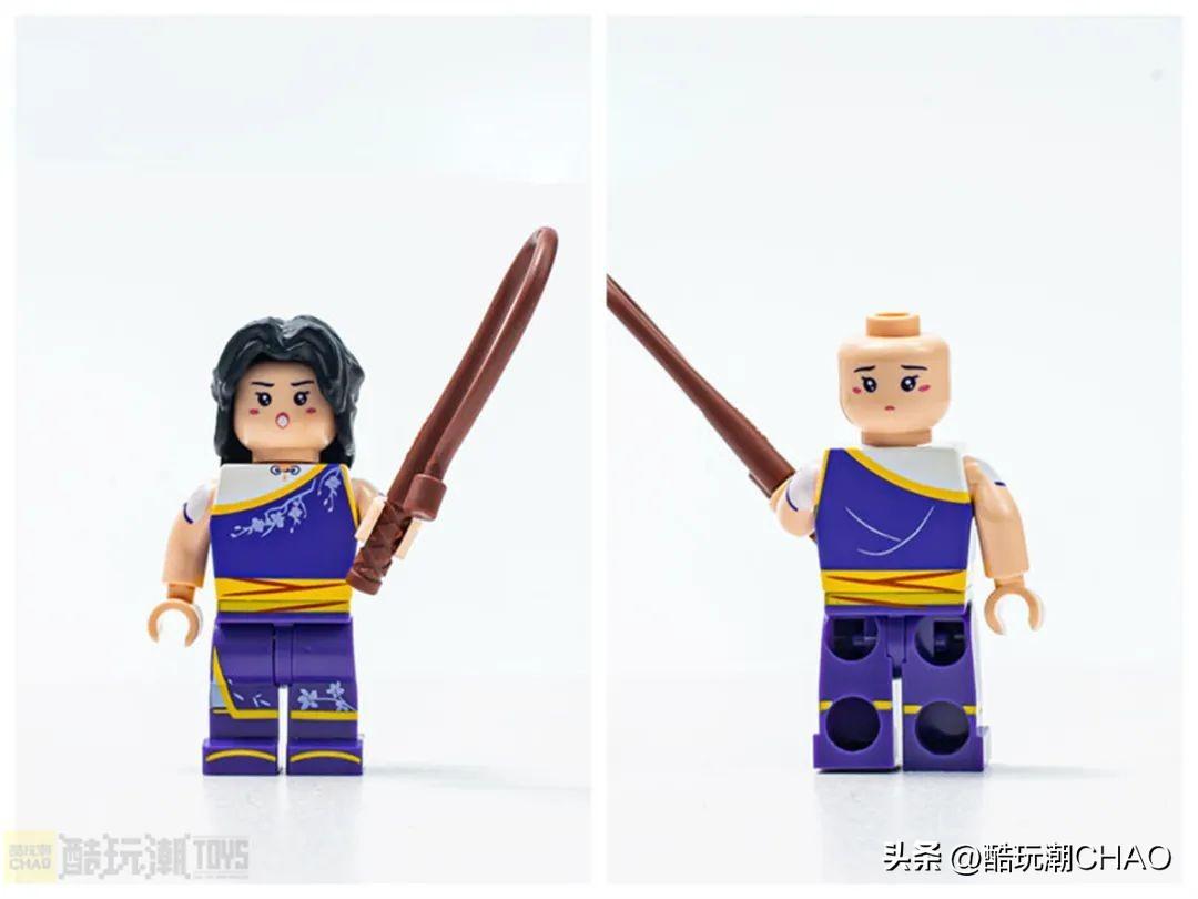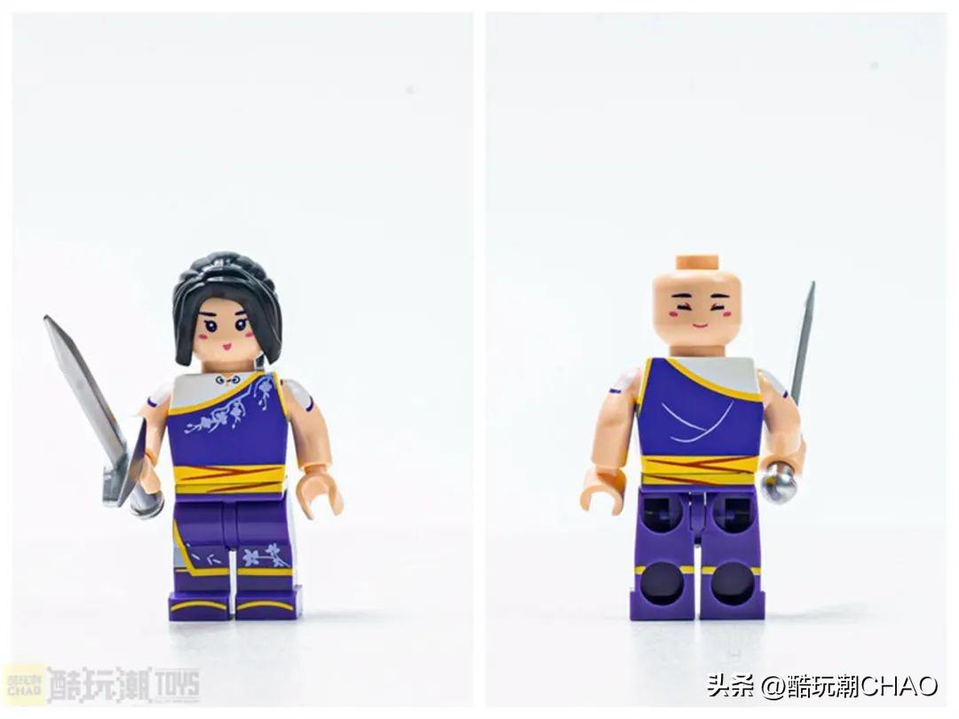 套装里出现了两个赵灵儿的人仔,按照拼装顺序,首先出现的是在仙灵岛洗澡的赵灵儿。人仔没有腿部,直接放在场景里,代表正在洗澡情景。配有一个人仔身体,代表放在岸边的衣服。同时还有洗澡时被李逍遥发现的娇羞和微笑的双面表情。