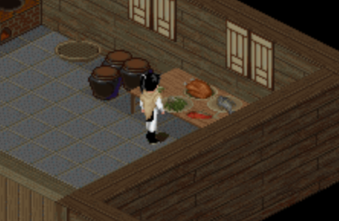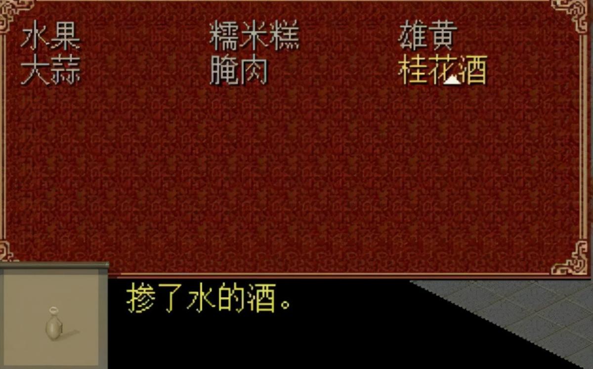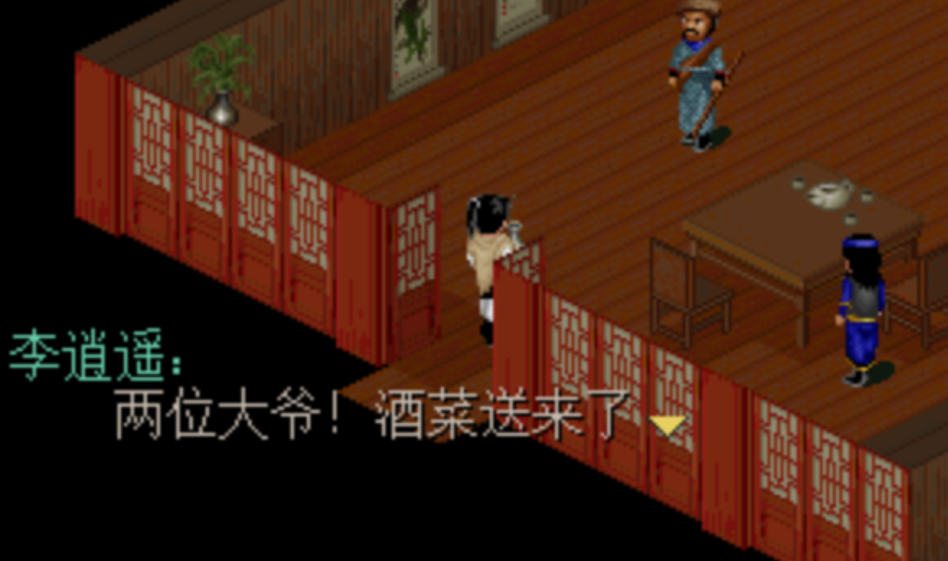 出来房间招待苗族客人,得到500文。下楼,见到酒鬼堵住门口,对话得知是要酒喝。