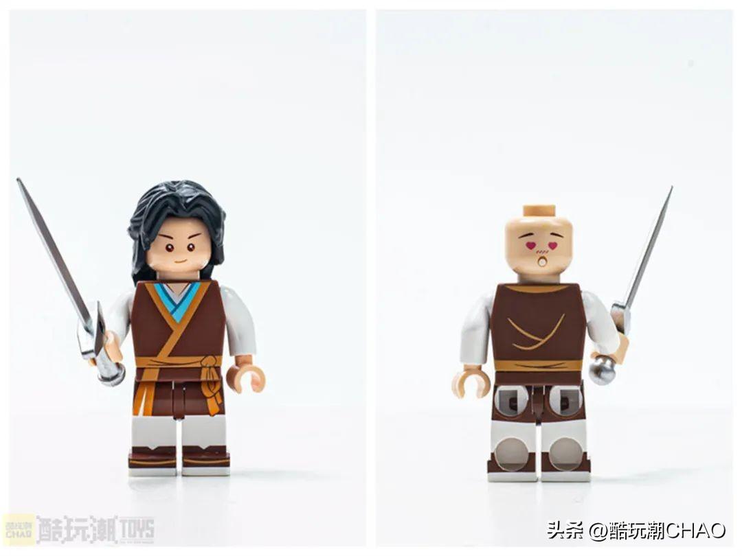 在这个套装里,同时给了三个李逍遥的人仔。按照拼搭顺序,首先出场的是在林月如比武招亲的擂台上的李逍遥,人仔手持一把剑,身体和腿部都有相应的印刷,有一个微笑和赢了擂台之后的花痴双面表情。