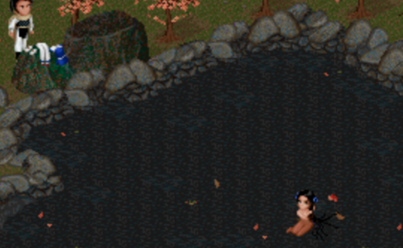 这个场景里 ,配备了一个没有腿部,只有上半身的赵灵儿人仔,放在池塘中央。这里和游戏原作稍有出入,场景里给赵灵儿设计了一个抹胸,而在游戏中赵灵儿的出现的时候,场景可谓是十分香艳。同时还有一个人仔身体放在旁边,代表着赵灵儿洗澡时,放在池塘边的衣服。