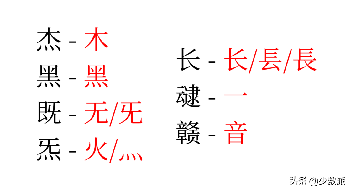 举个例子,杰、黑、叇、赣、长、既、炁,这七个字应当用于检索的主部首 分别是什么?