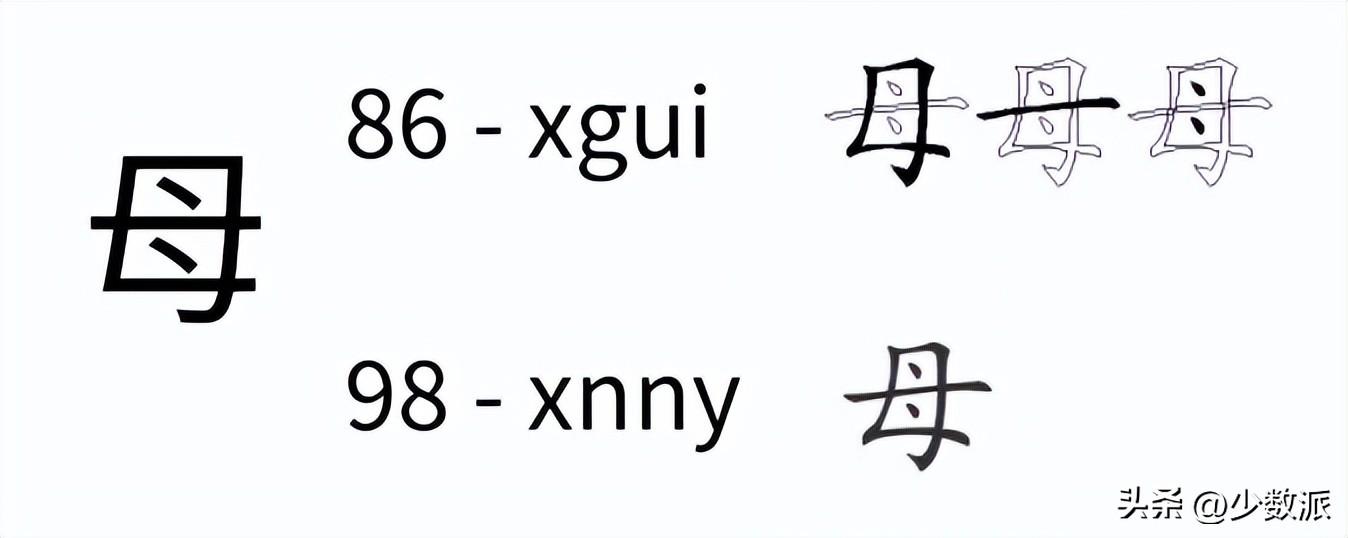 拆字取码是否适合人们的日用频率,是否符合写字、认字的一般规则,都会影响拆字取码,尤其对初学期刚刚了解基本字根的使用者。比如我们相对比较熟悉的五笔 86,我个人感觉它难上手,是因为它为了兼容一些部分部件相通的字形,采用了很多本身是破碎的字形,比较典型的例子就是「母」字。