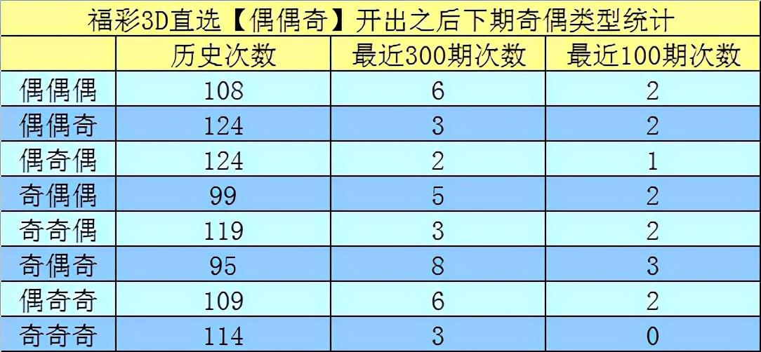 前7次出现偶偶奇类型奖号分别为:647、447、407、601、283、023、045,其下期分别开出奖号:066、752、053、920、396、929、708。