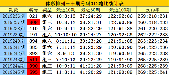 排列三第2019245期奖号为:595,号码012路比为1:0:2。