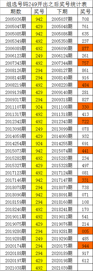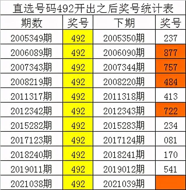 从上表统计可以看出,直选号码492开出之后,其下期奖号: