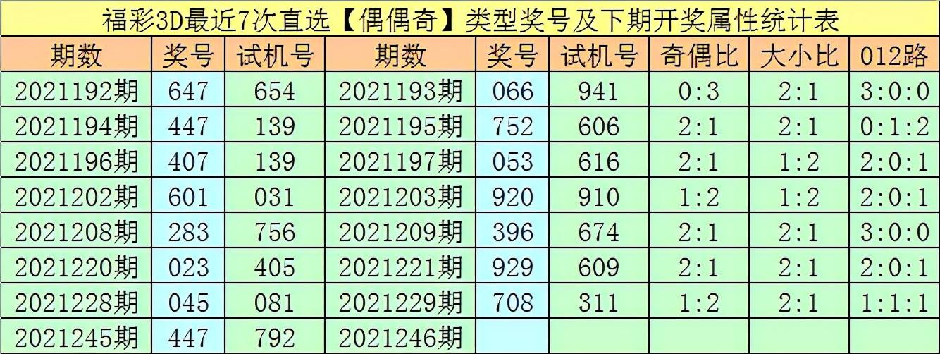 开奖回顾:福彩3D第2021245期开奖号码为447,试机号为792。奖号直选类型为:偶偶奇、小小大和111路。