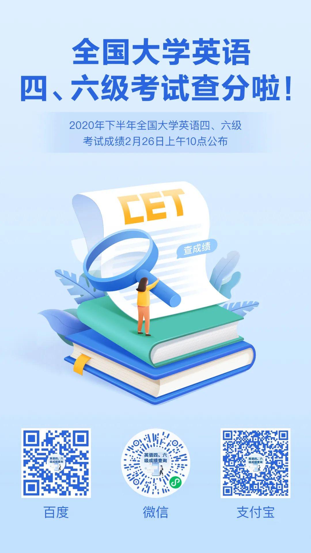 2020年下半年全国大学英语四、六级考试 成绩今天上午10点正式公布。国务院客户端小程序上线由教育部考试中心提供的全国大学英语四、六级考试(CET)成绩查询,快来查查你过了没~