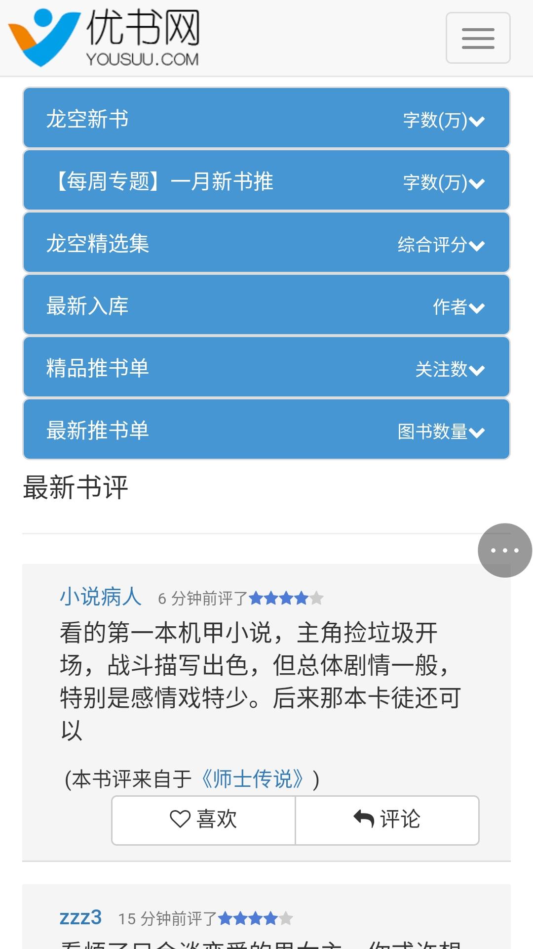 平时比较闲,又喜欢看网络小说的朋友可以逛一下这个网站:优书网可以按字数、更新时间、评分等条件筛选。网站主要提供网友们对小说的评价与评分。网站还有一个特色就是上面有很多网友根据不同口味推荐的书单。不过需要说明的是该网站不提供小说下载。