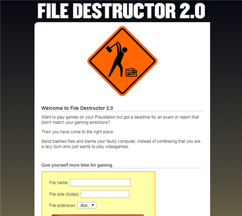这是一个比较好玩的网站,可以帮助你生成一些特定的损坏文件,如果你想交给你老板的文档没弄好就可以用它帮助你生成一个损坏的文件,这样就可以有理由重新做。他还支持各种文件的格式,大小和名字都可以由你来制作。