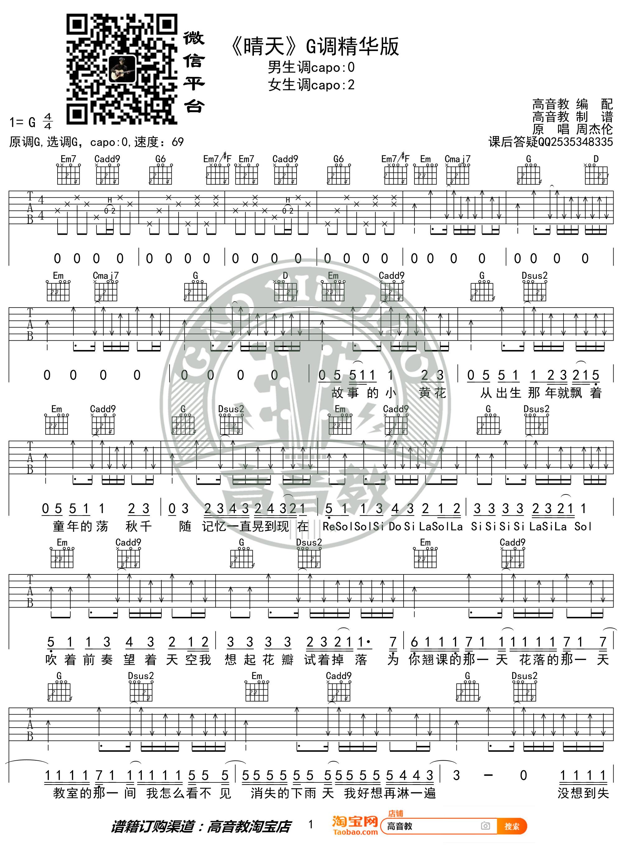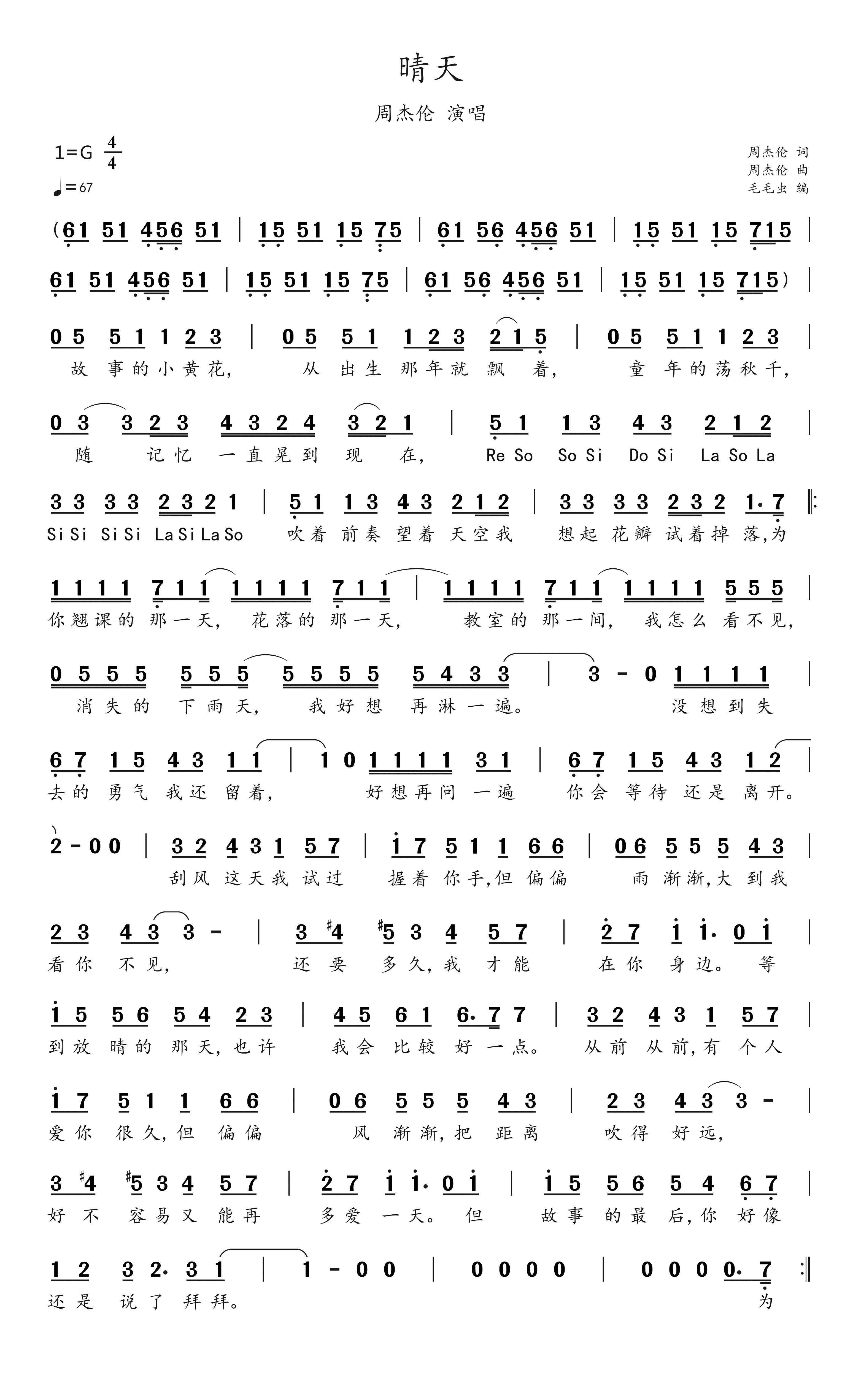 五线谱、简谱,双版本:周杰伦《晴天》,收下吧