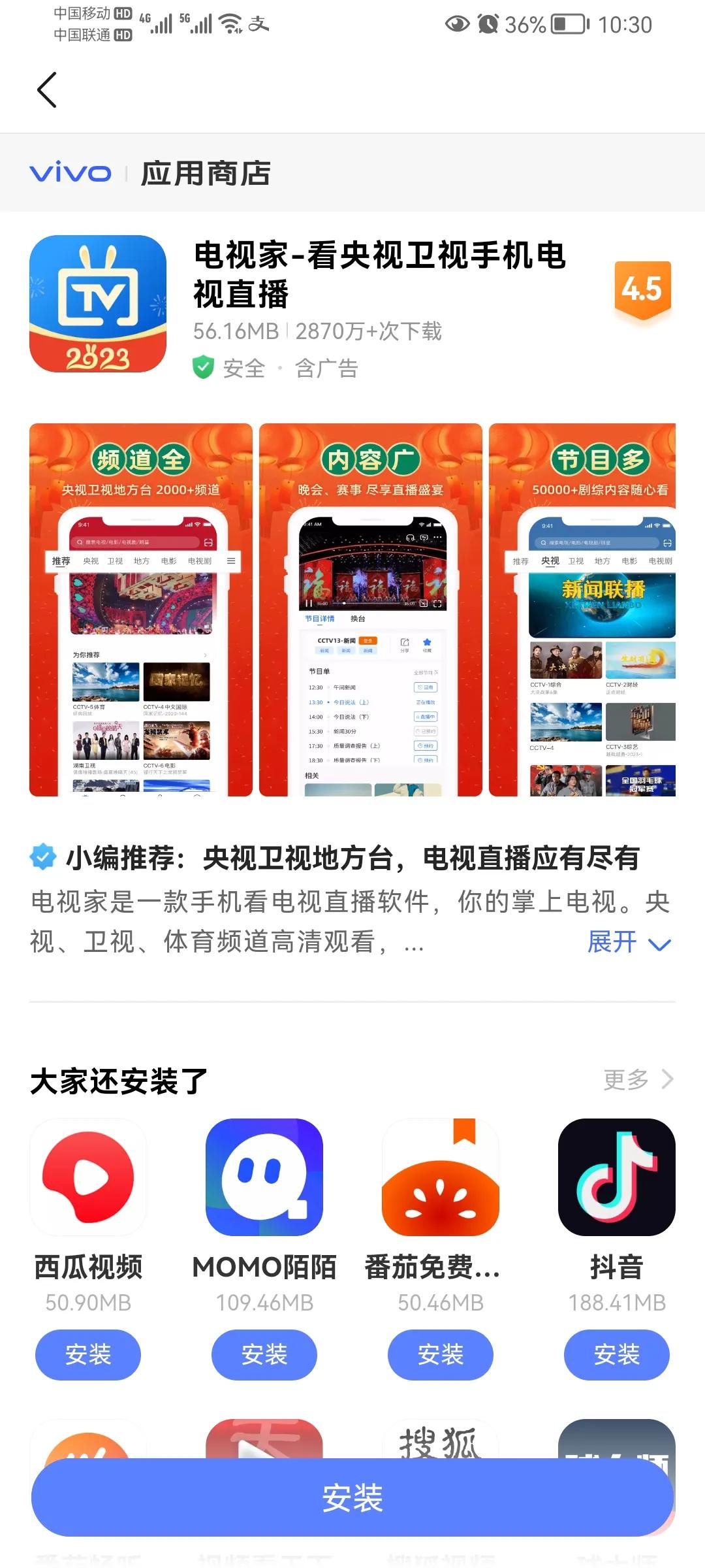 感兴趣的朋友可以试试,不过电视自带的应用商店没有电视家,小薇直播,火星直播等直播软件,需要我们先下载安装包到一个u盘上,然后将u盘插入电视!运行电视机的电视管家(直接打开u盘有的电视不识别安装包)。安装后就可以啦!