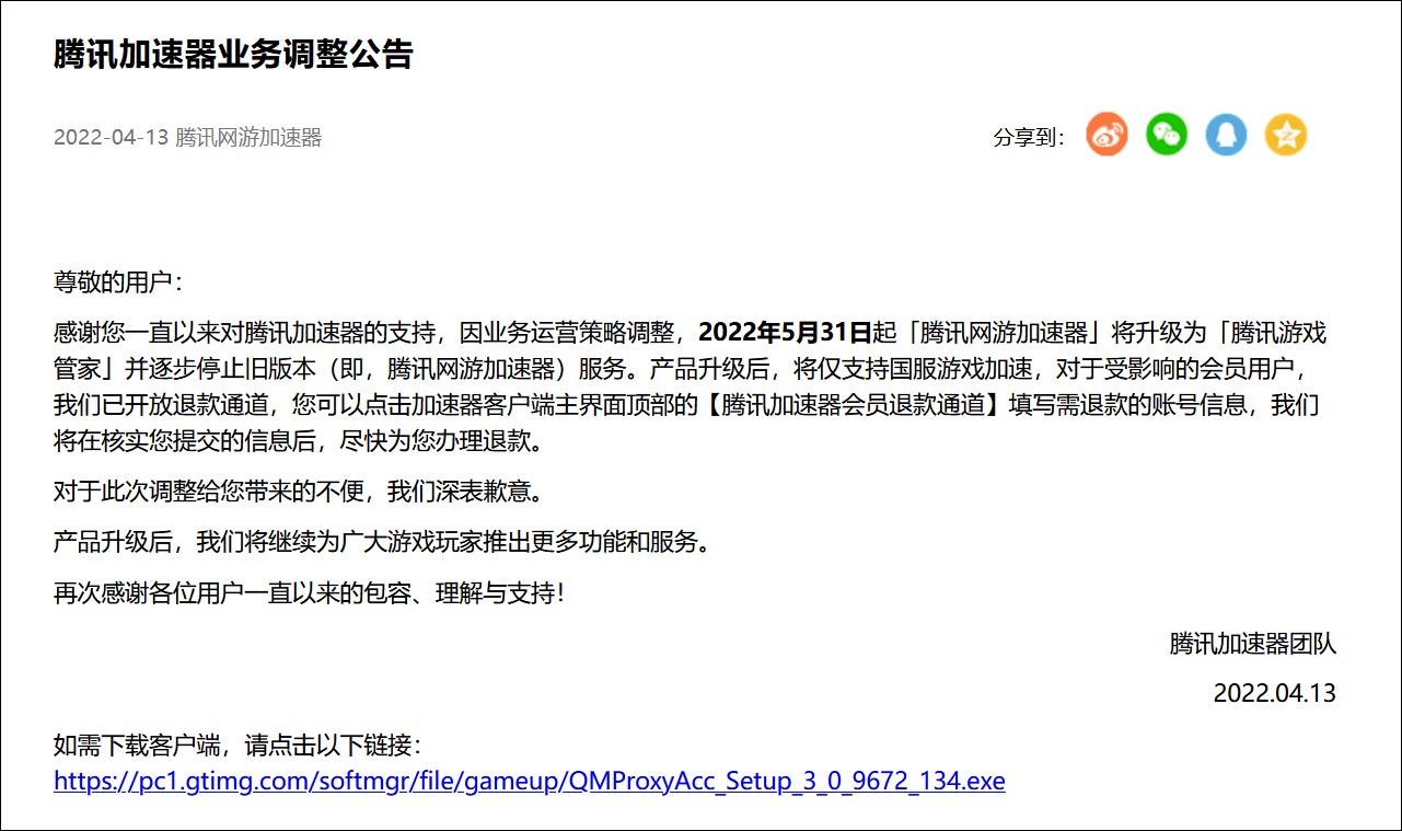 4月13日,腾讯网游加速器发布《腾讯加速器业务调整公告》,宣布自2022年5月31日起将“腾讯网游加速器”升级为“腾讯游戏管家”并逐步停止旧版本(即“腾讯网游加速器”)服务。产品升级后,将仅支持国服游戏加速。
