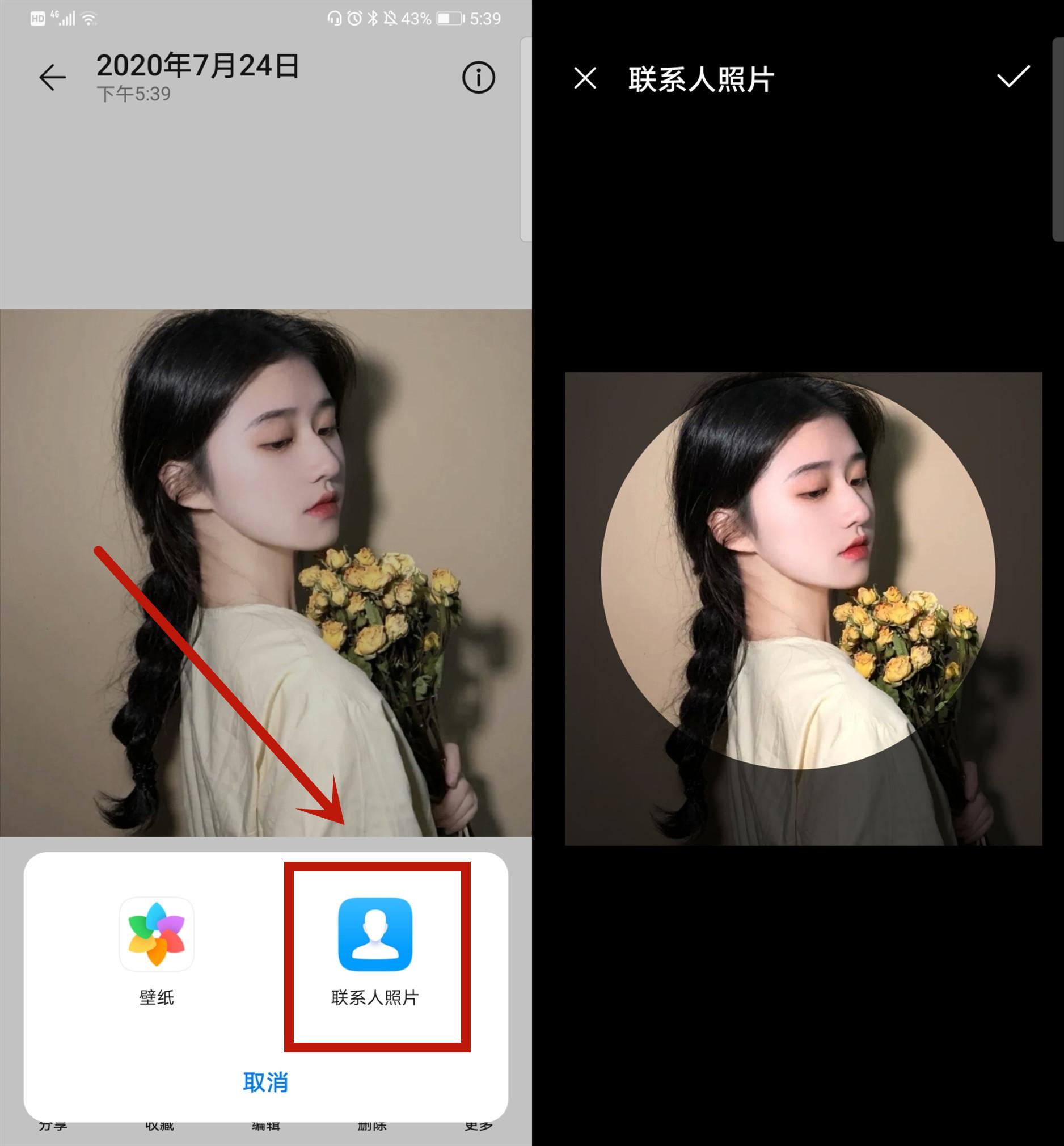 点击该头像的当事人,进行图片大小剪切,尽量剪切的较大一点,显示出来的样式也更加好看!点击右上角"对号" 按钮,即为设置成功,当对方来电时,直接在页面上显示整张照片。