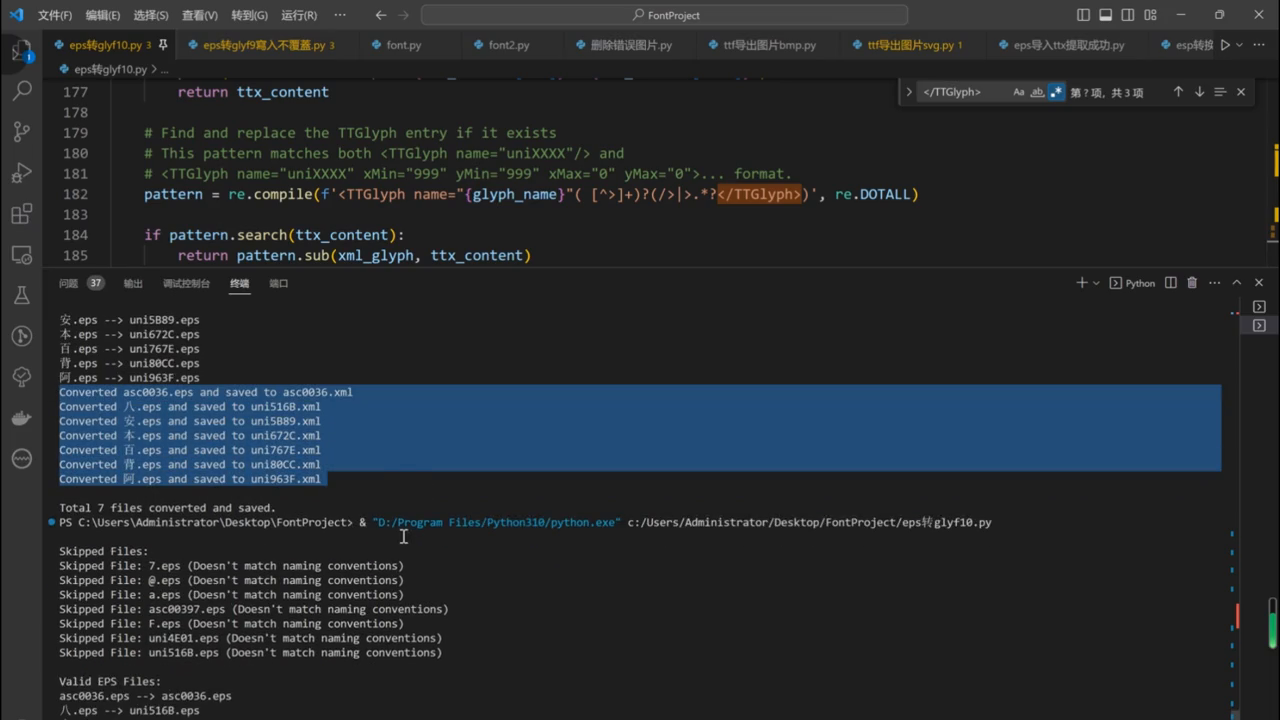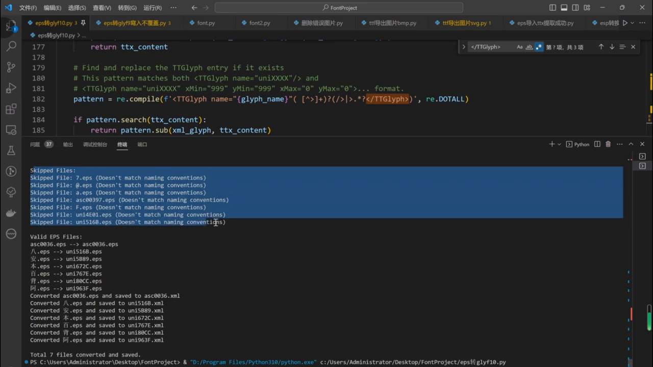 再使用软件,是最后一步,把图片写到字体库这个 tts数据库里边,再转换成 ttf,就变成了字体。现在点击执行,点击执行。执行完成之后可以看一下,过滤掉命名规则错误的名字而保留有有效的命名规则。比如,这个八会加一个优雅开头的编码,这个字体库里边是识别的,可以直接进行转报。之后在中间的时候又做了保存,当然过程到时候可以省略。