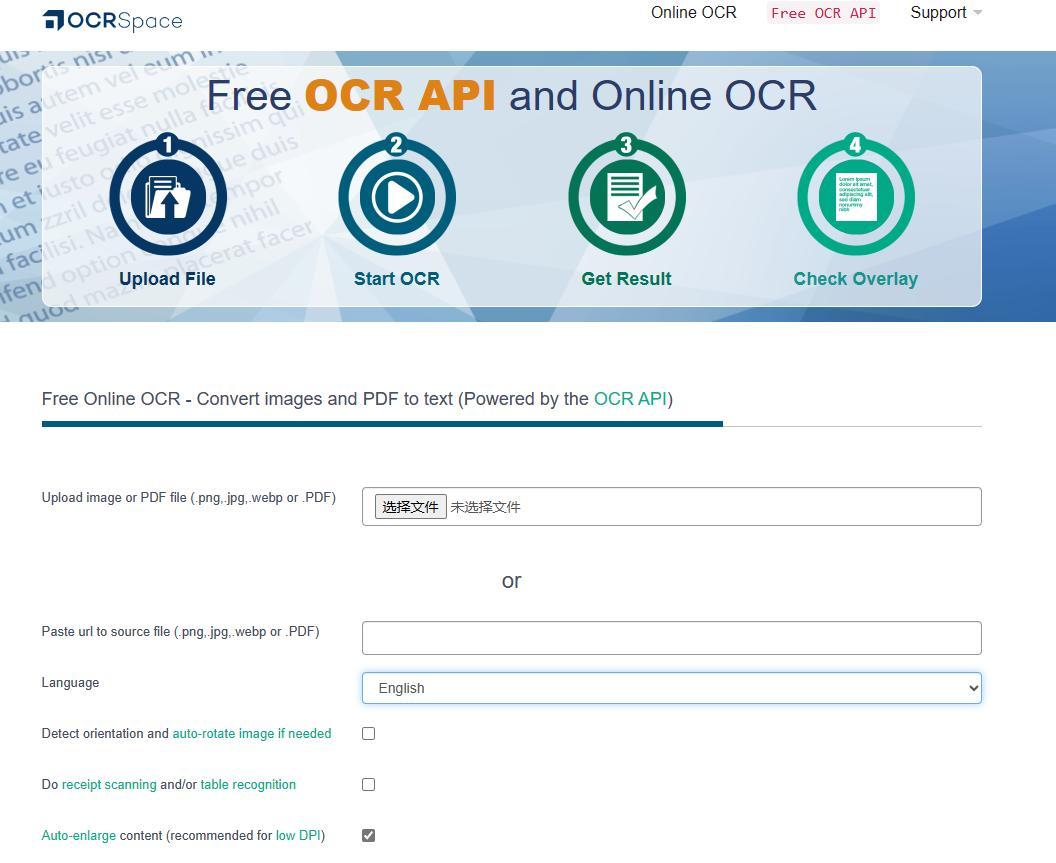 然后为大家介绍的是OCR.Space,这是一款在线OCR平台,它可以通过API接口进行文字识别。它支持多种语言和图片格式,包括常见的图像文件格式和PDF文件。该平台的识别准确度高,且提供多种输出格式,包括TXT、PDF和WORD等。我们可以通过上传图片或文档,或者通过URL链接进行文字识别。