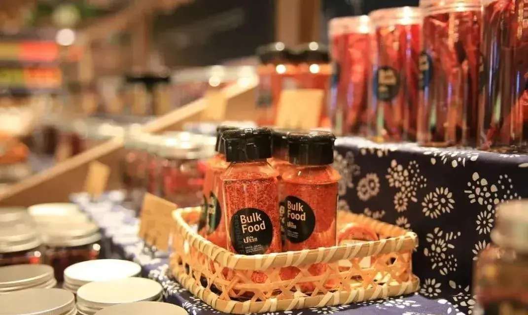 E:小菜,按照五级分类顺序,上面层板用于陈列瓶装酱菜等。下面斜口篮陈列袋装酱菜,尽量和上方陈列商品分类相同。如陈列条件允许且袋装品项数多,可用斜口篮单独陈列袋装。