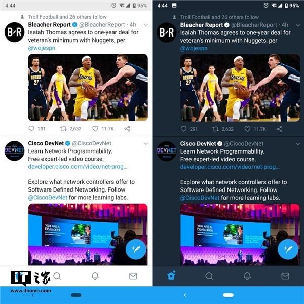 当然,这一底栏设计也付出了代价,用户无法在主页、搜索等几个标签页之间左右滑动切换。此外,在启用夜间模式的时候,应用的底部导航栏不是纯黑色,而是深蓝色。