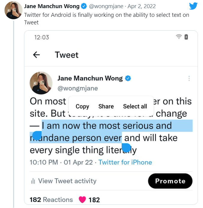 近日,以逆向工程 App 寻找新功能而闻名的 Jane Manchun Wong 表示,Twitter 将允许安卓用户在推文中自由选择文本,从下图可以看到这一最新的功能,不过还没有实装上线。
