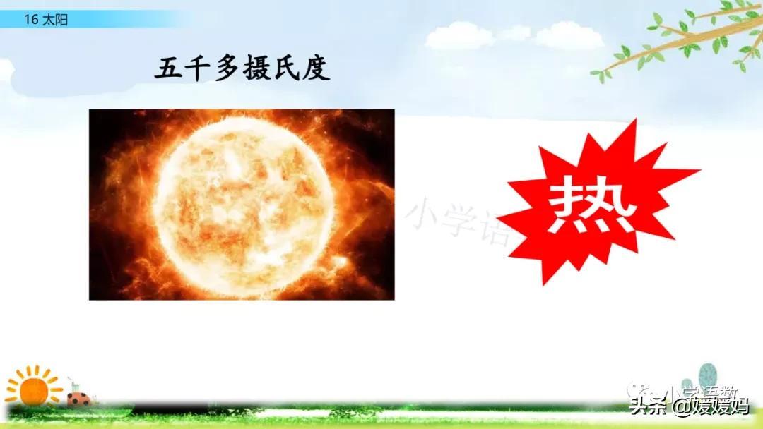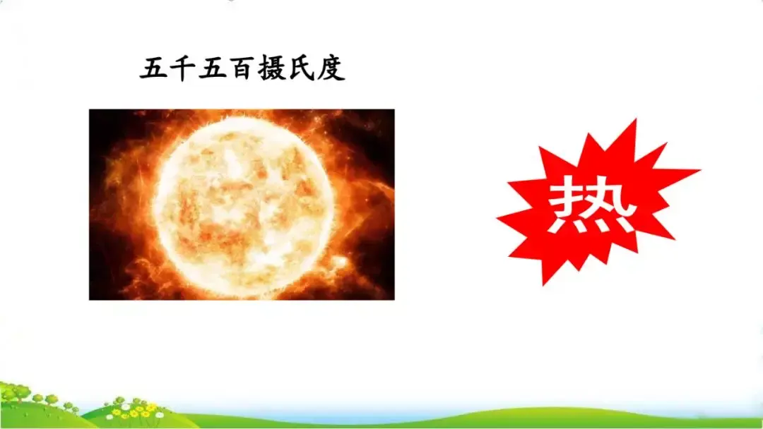 3、太阳会发光,会发热,是个大火球。太阳的温度很高,表面温度有五千五百摄氏度,就是钢铁碰到它,也会变成气体。