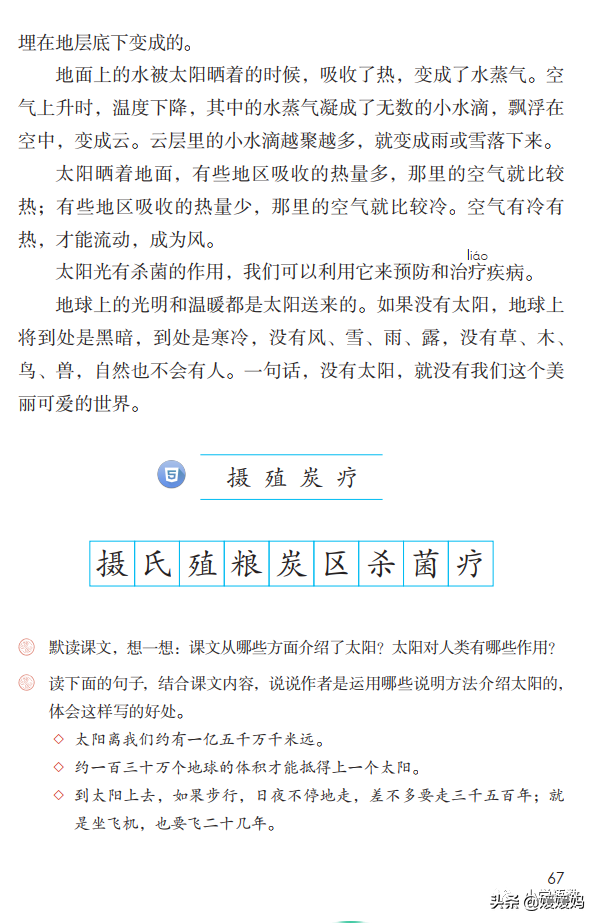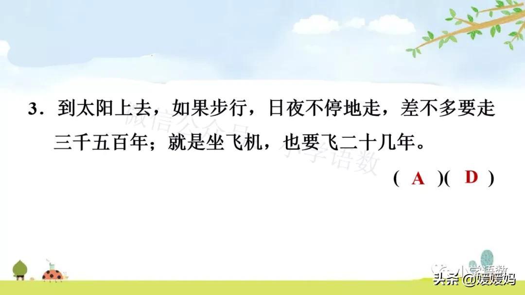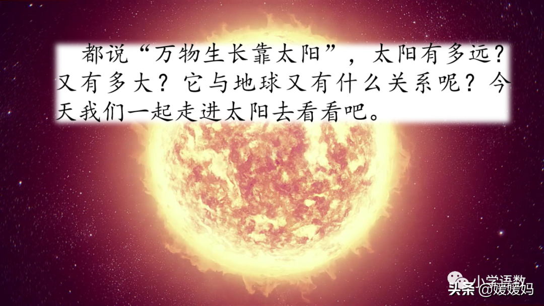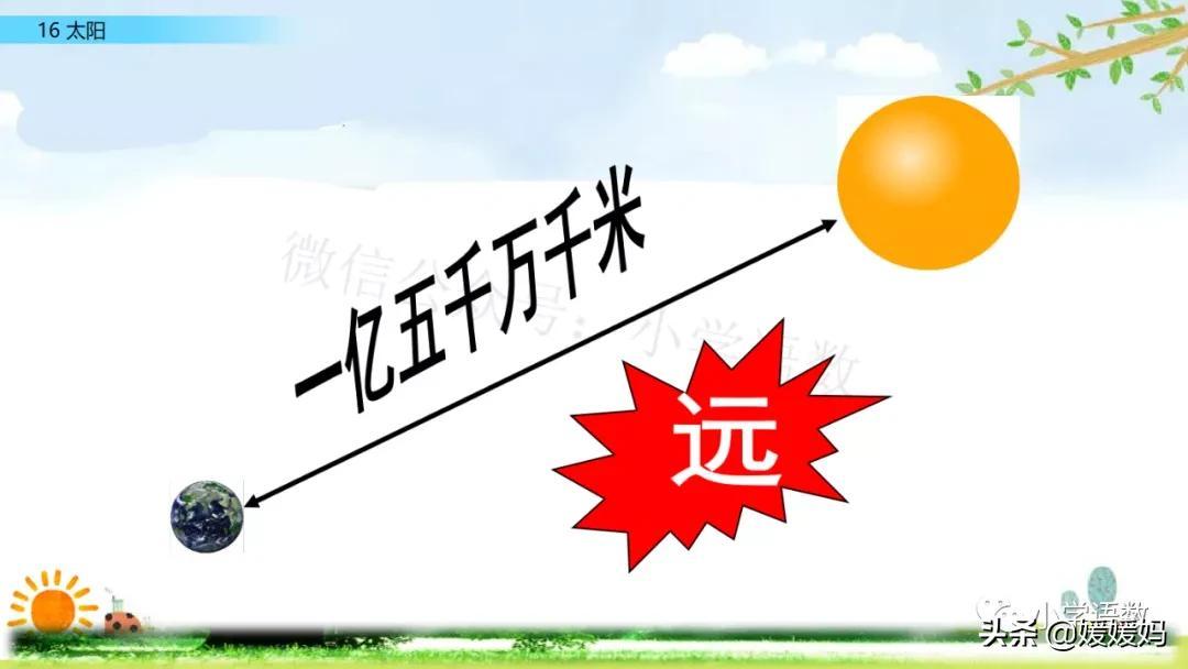 2.其实,太阳离我们约有一亿五千万千米远。到太阳上去,如果步行,日夜不停地走,差不多要走三千五百年;就是坐飞机,也要飞二十几年。
