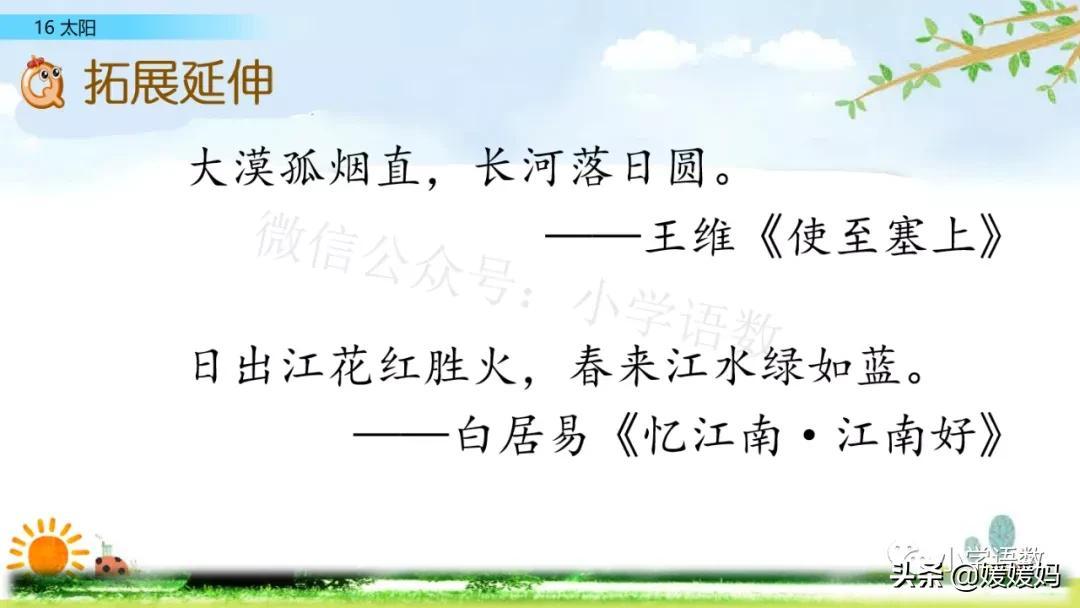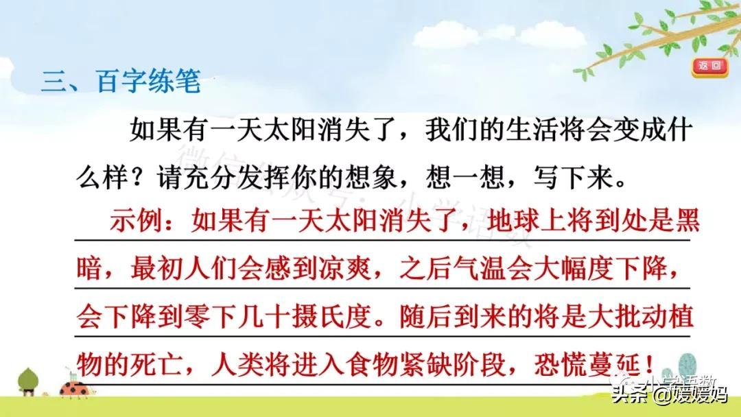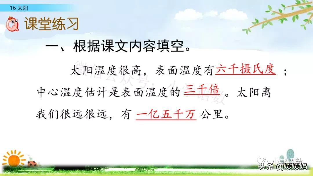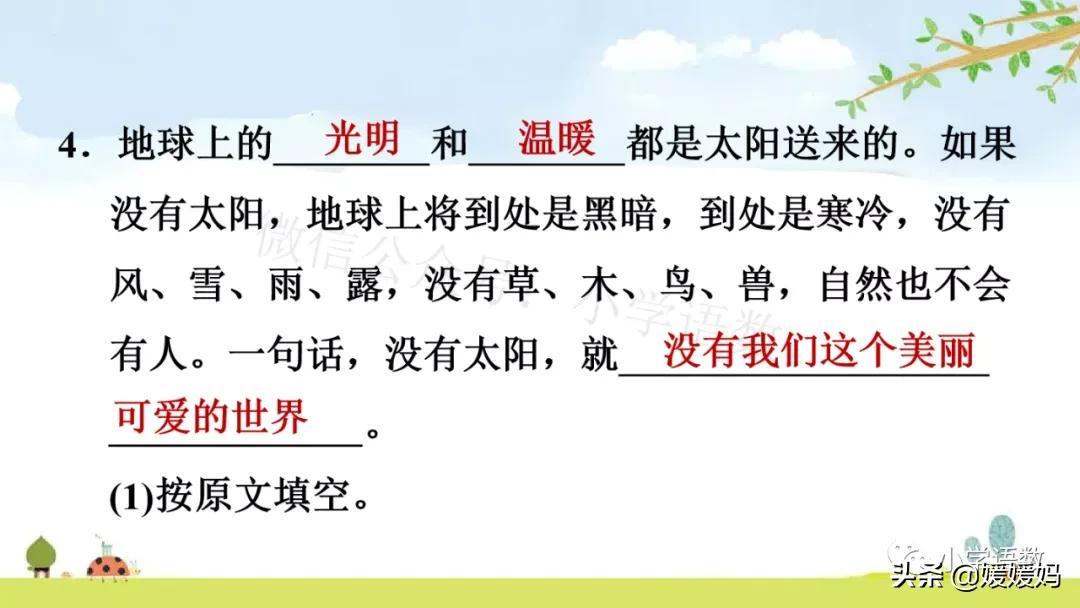 2.球上的光明和温暖都是太阳送来的。如果没有太阳,地球上将到处是黑暗,到处是寒冷,没有风、雪、雨、露,没有草、木、鸟、兽,自然也不会有人。