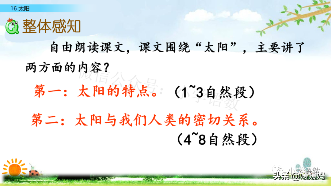 第一部分(1~3)分别从太阳距离地球远、体积大、温度高三个方面介绍了太阳。