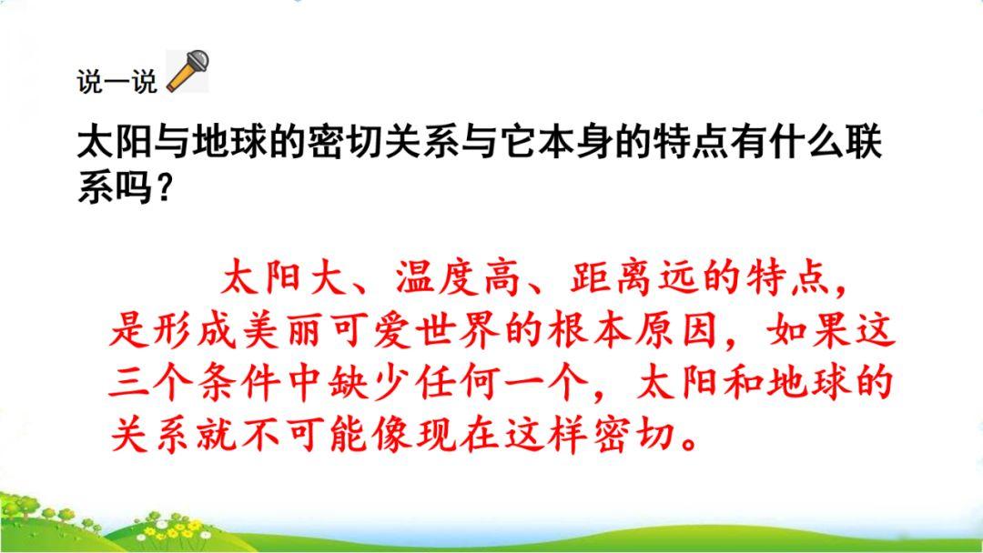 太阳大、温度高、距离远的特点,是形成美丽可爱世界的根本原因,如果这三个条件中缺少任何一个,太阳和地球的关系都不可能像现在这样密切。