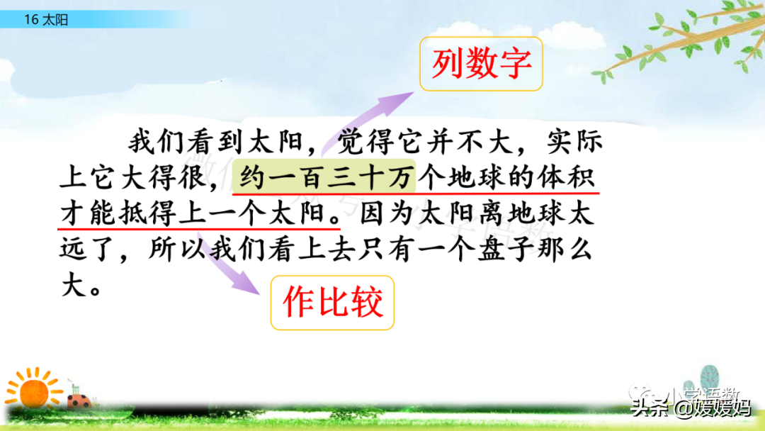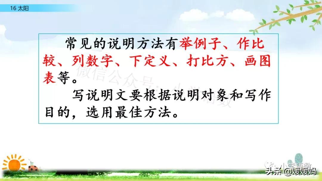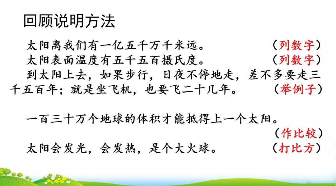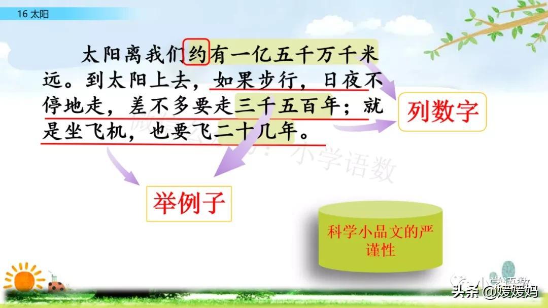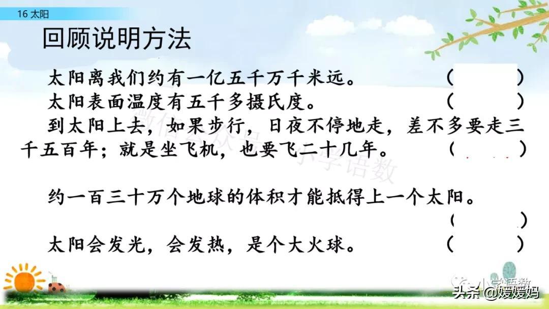 ①远:“太阳离我们有一亿五千万千米远。到太阳上去,如果步行,日夜不停地走,差不多要走三千五百年;就是坐飞机,也要飞二十几年。”这两句话运用列数字的说明方法,说明了太阳离我们很远这一特点。(公众号:小学语数)