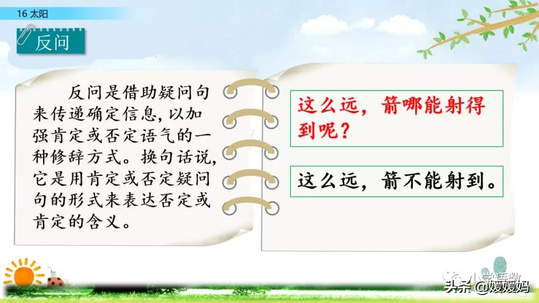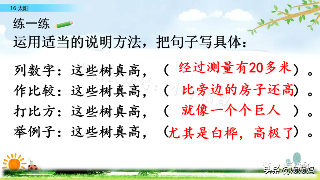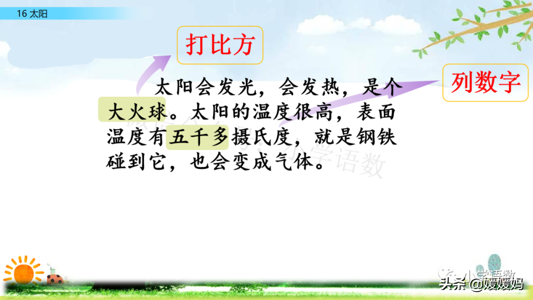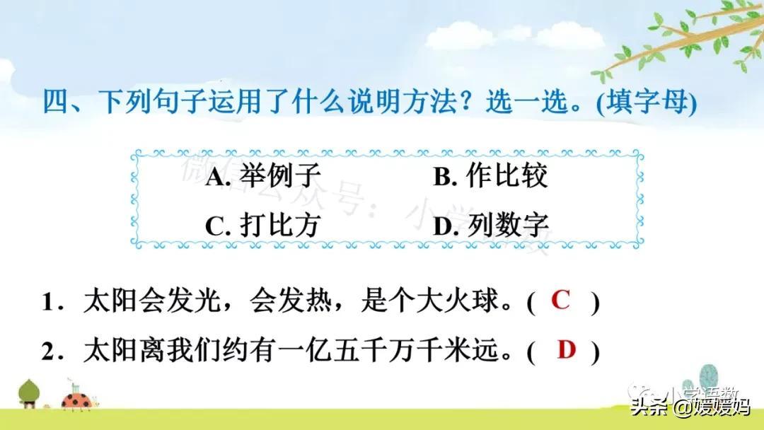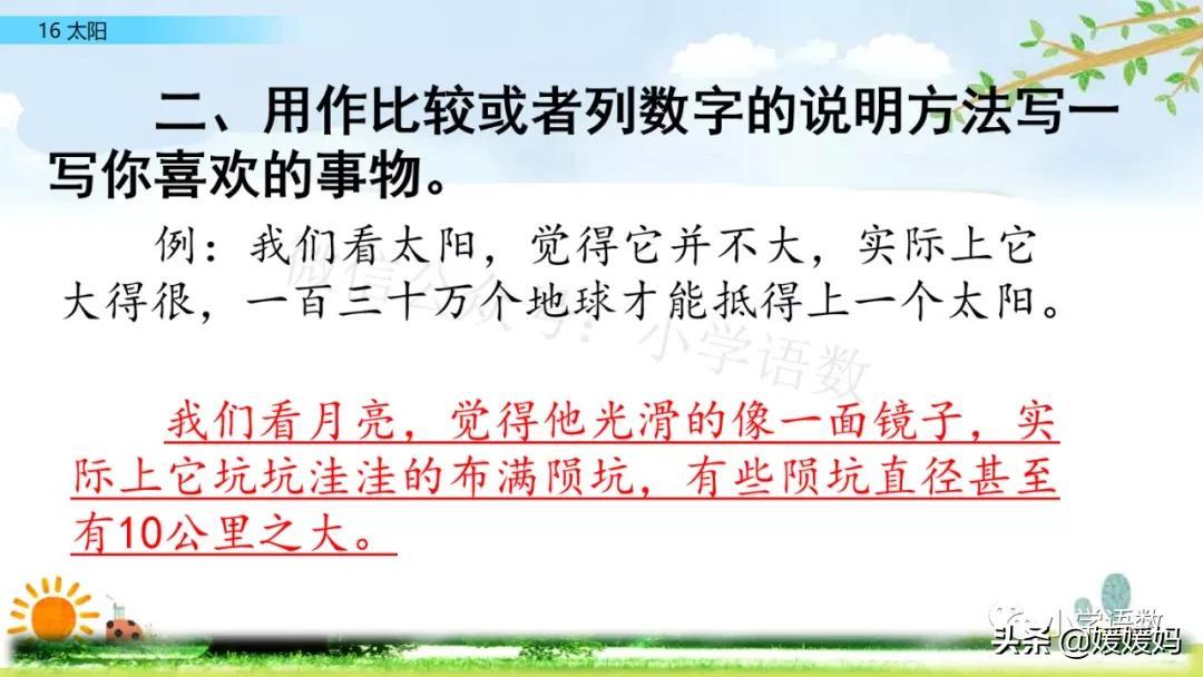 ①远:“太阳离我们有一亿五千万千米远。到太阳上去,如果步行,日夜不停地走,差不多要走三千五百年;就是坐飞机,也要飞二十几年。”这两句话运用列数字的说明方法,说明了太阳离我们很远这一特点。(公众号:小学语数)
