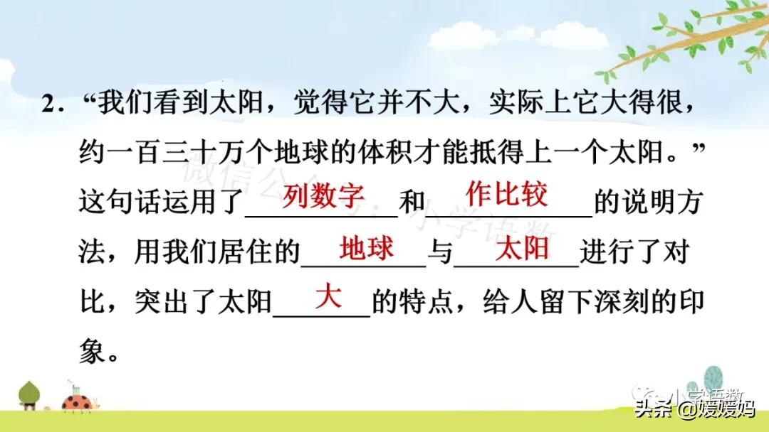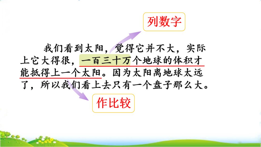 ②大:“我们看到太阳,觉得它并不大,实际上它大得很,一百三十万个地球的体积才能抵得上一个太阳。”这句话运用作比较的说明方法,突出地说明了太阳很大这一特点