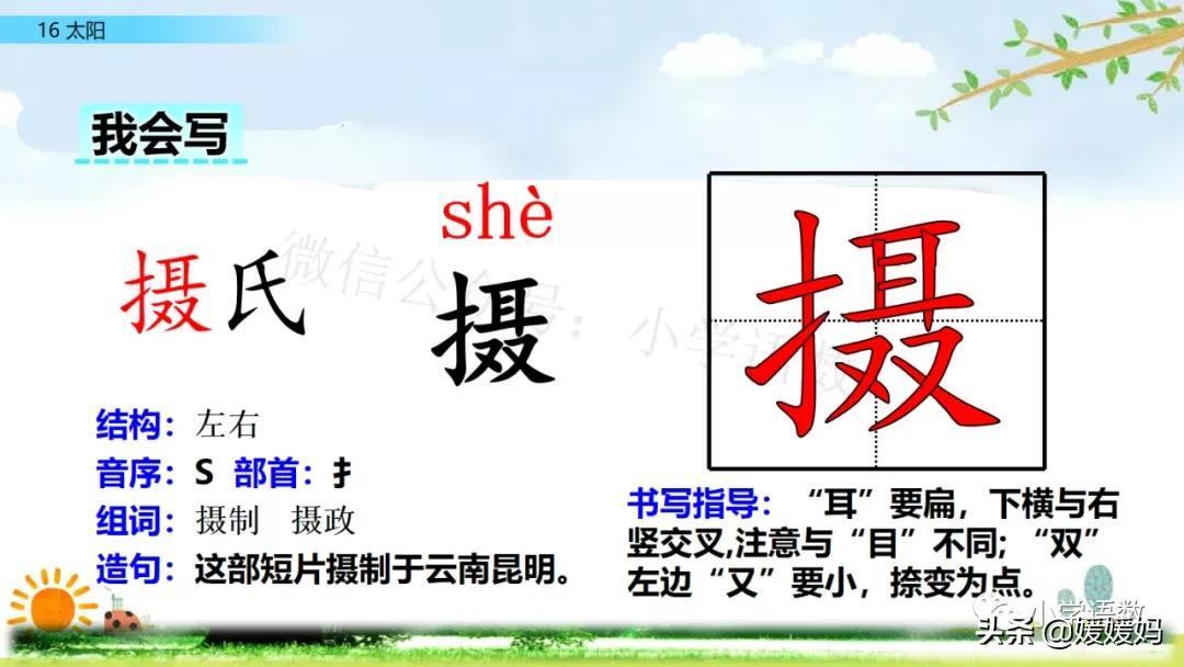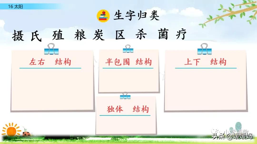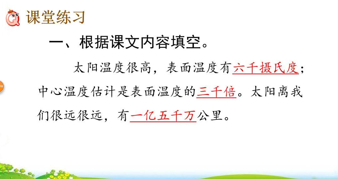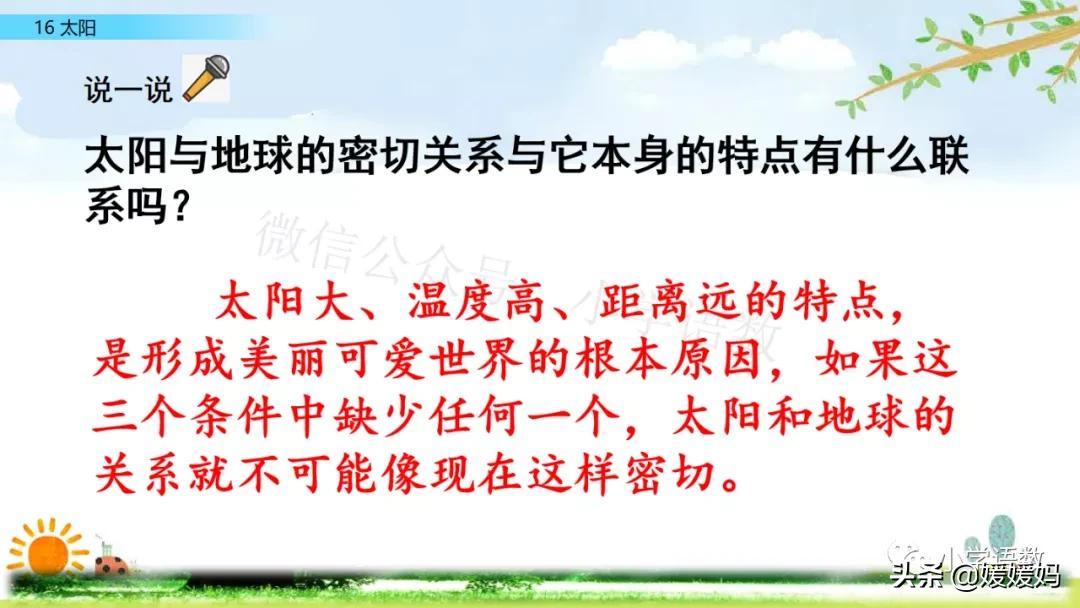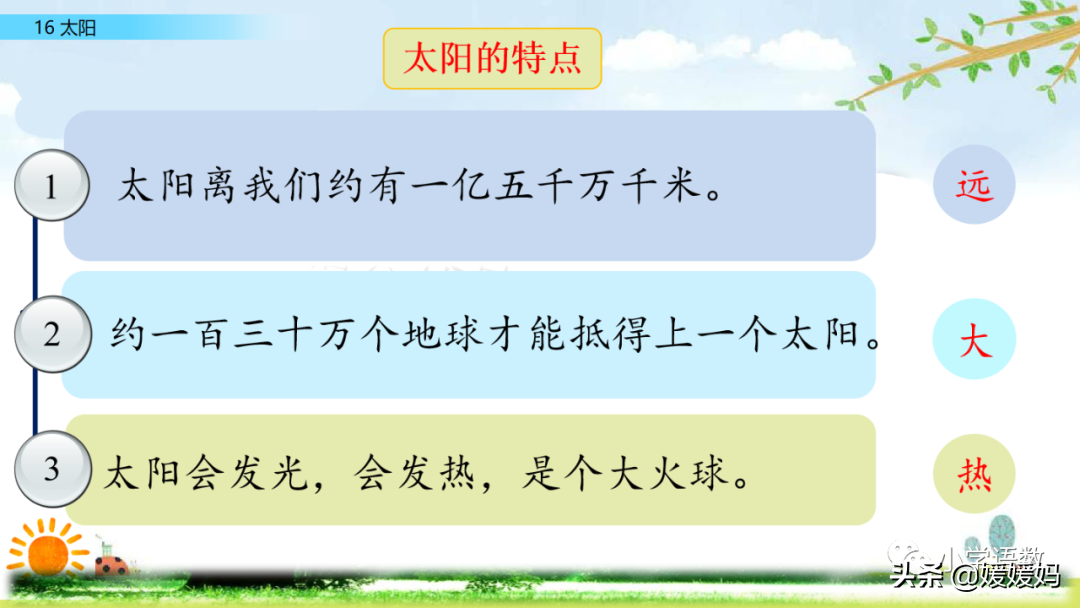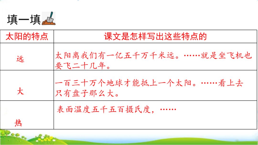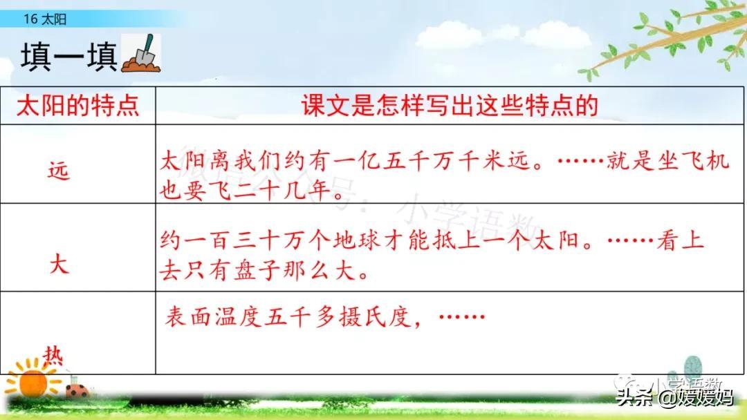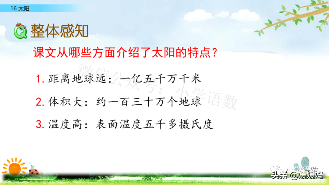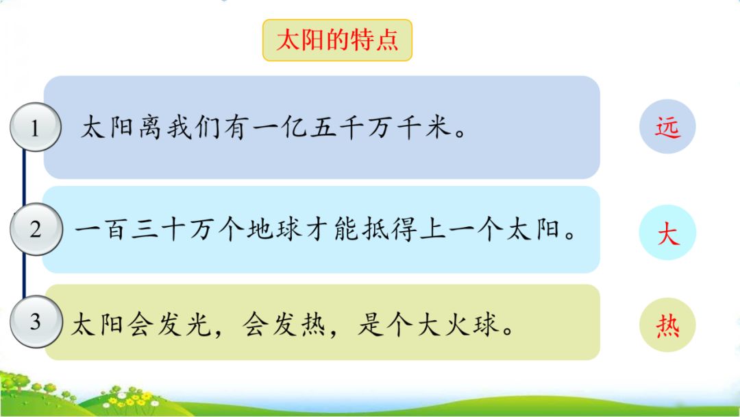 课文从三个方面介绍太阳的特点:(1)距离远;(2)体积大;(3)温度高。