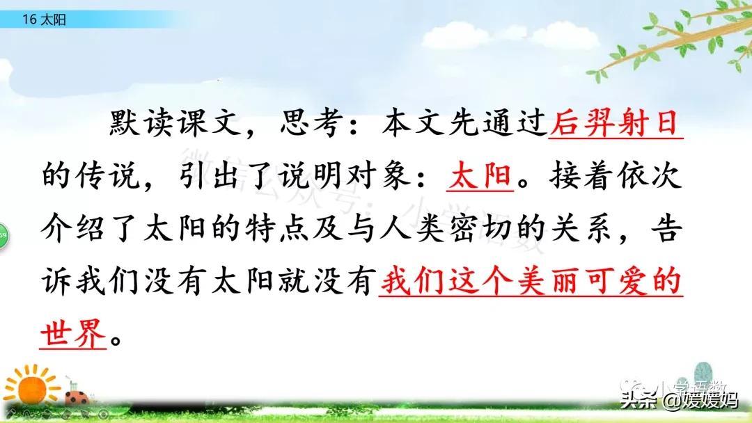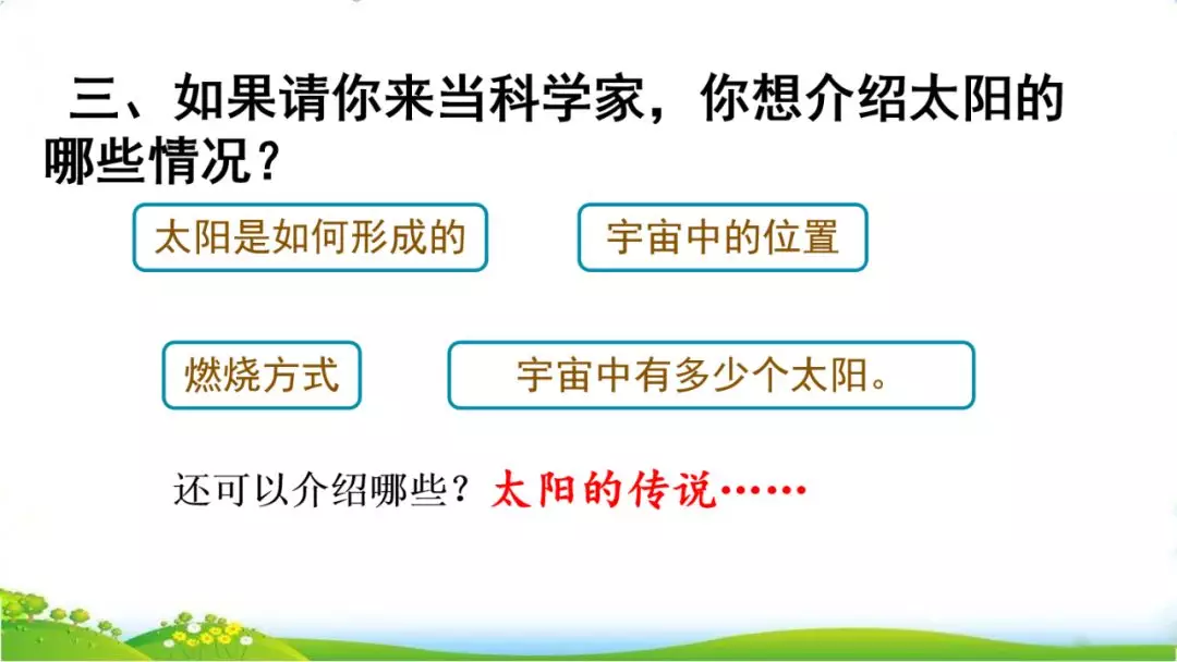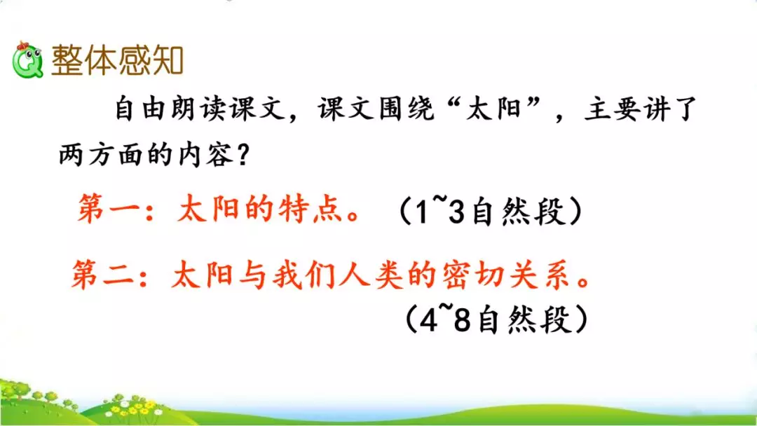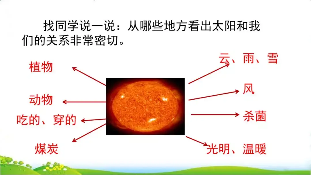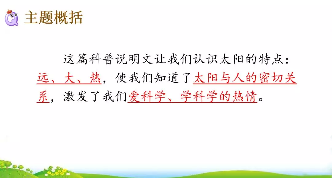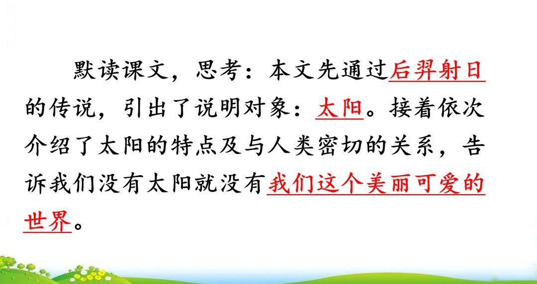 这篇课文向我们介绍了太阳的特点以及太阳与人类的关系,让我们懂得了太阳的重要性,激发了我们探索大自然奥秘的兴趣。