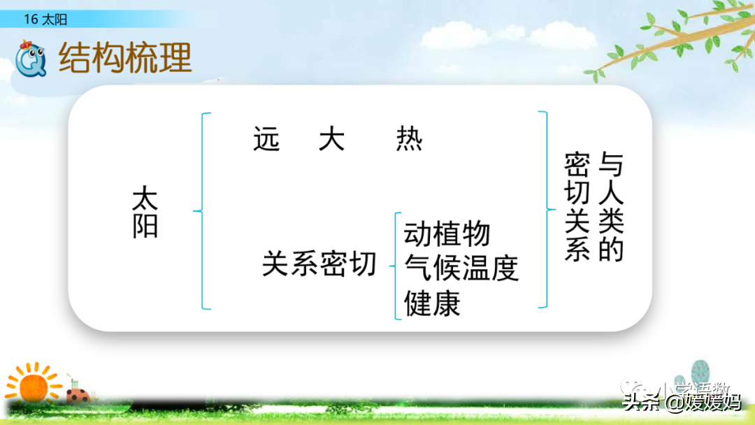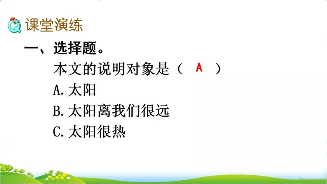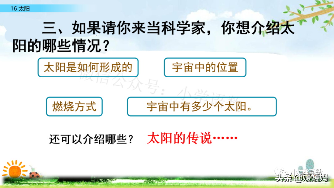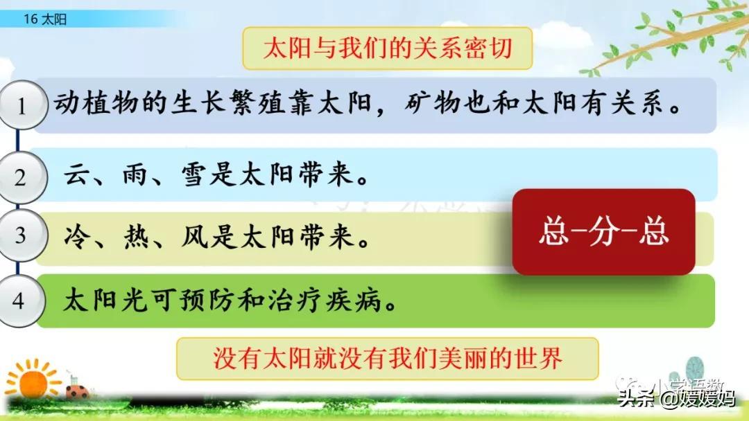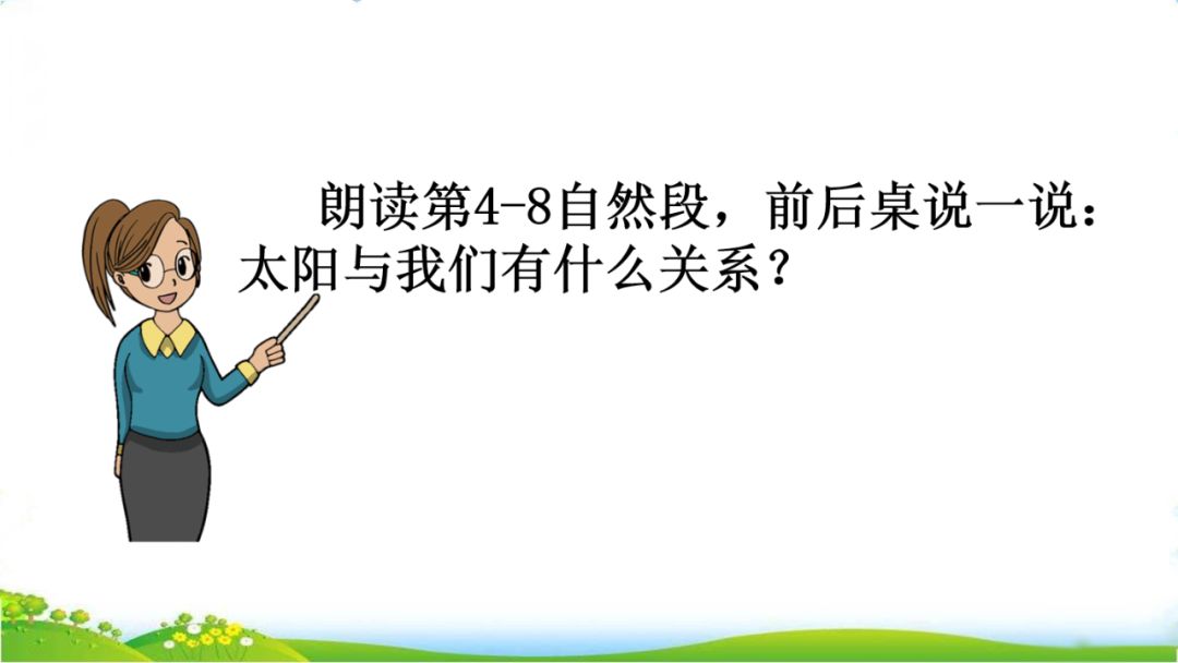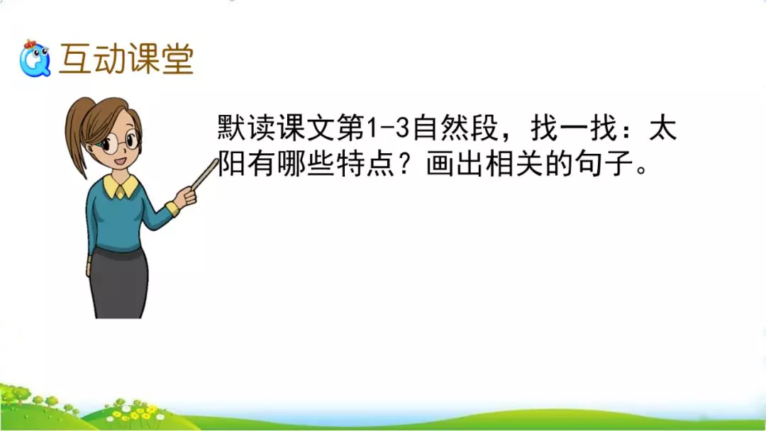 这篇课文向我们介绍了太阳的特点以及太阳与人类的关系,让我们懂得了太阳的重要性,激发了我们探索大自然奥秘的兴趣。