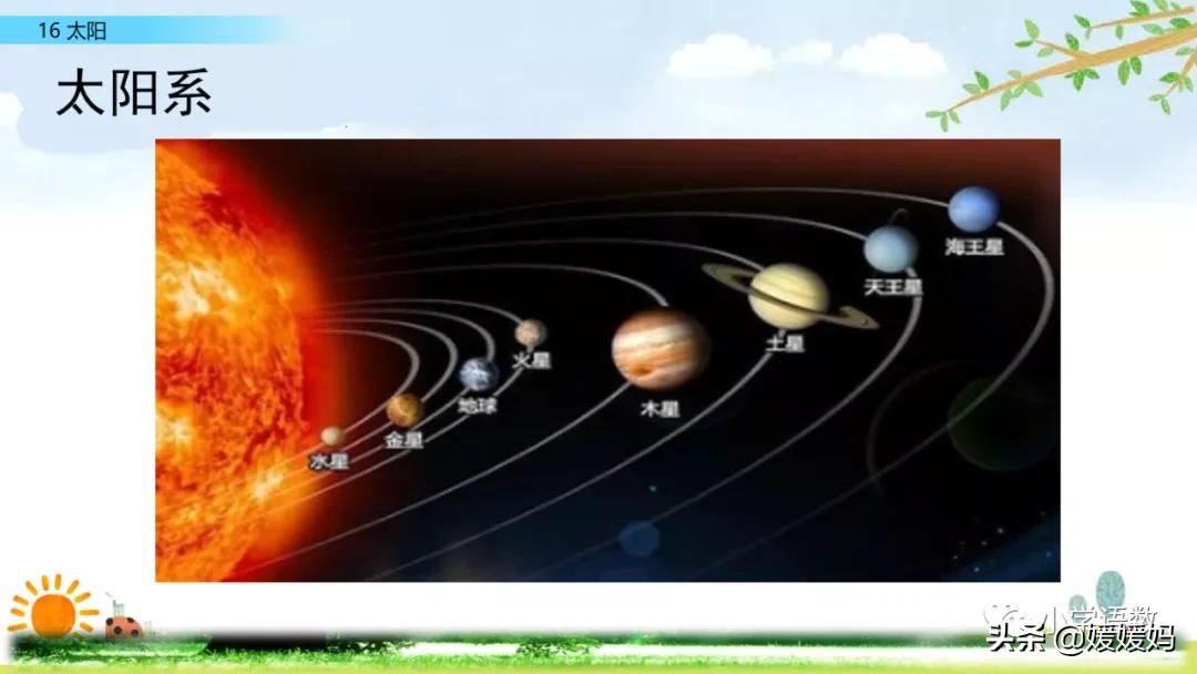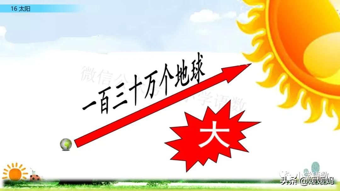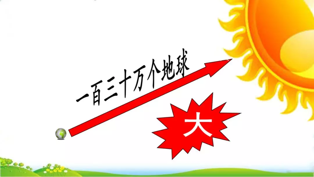 2、我们看到太阳,觉得它并不大,实际上它大得很,一百三十万个地球的体积才能抵得上一个太阳。因为太阳离地球太远了,所以看上去只有一个盘子那么大。