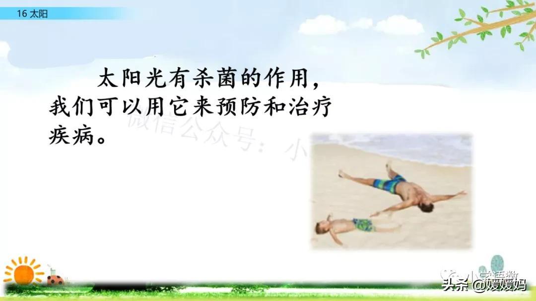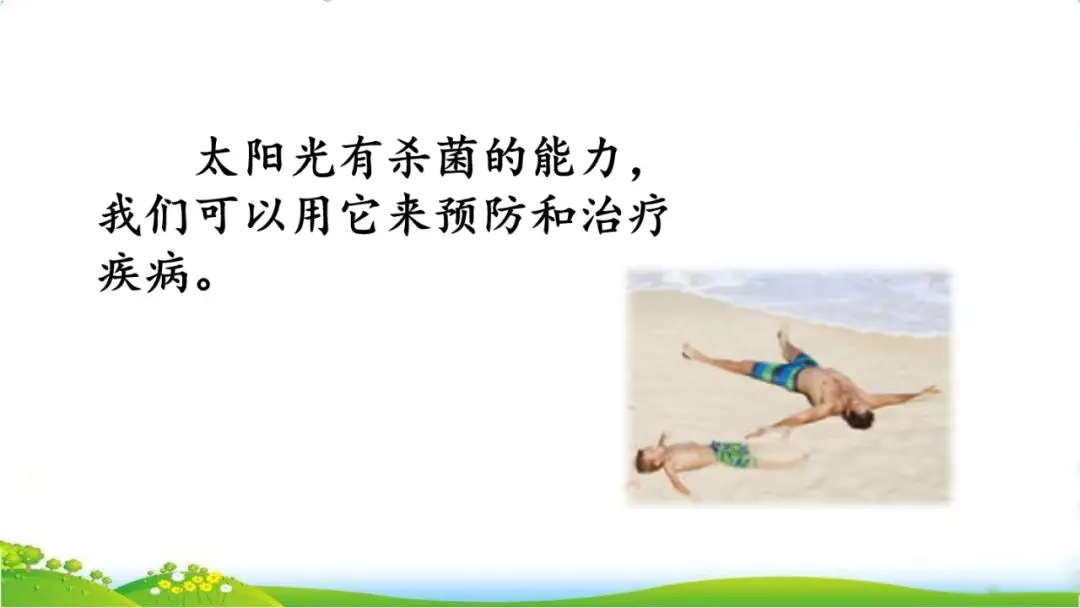 7、太阳光有杀菌的能力,我们可以利用它来预防和治疗疾病。