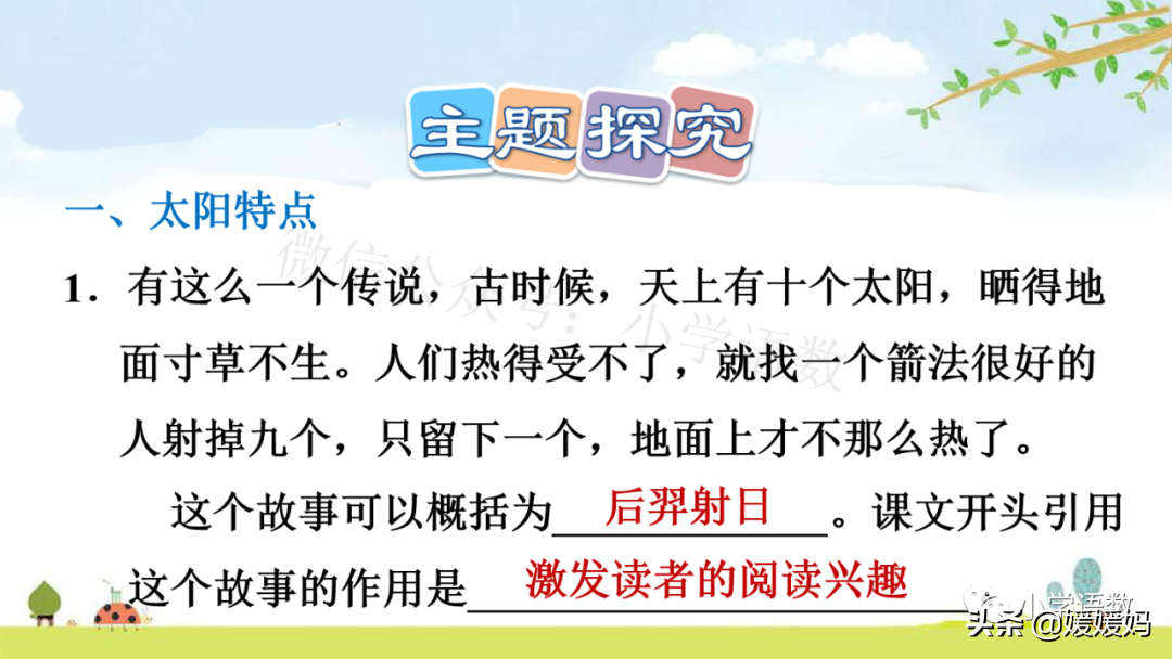 这里的传说,指的是“后羿射日”这个神话传说。课文以神话传说开头,一是为了吸引读者,二是针对这个传说,很自然地引入对太阳的有关知识的介绍,起到了一箭双雕的作用。