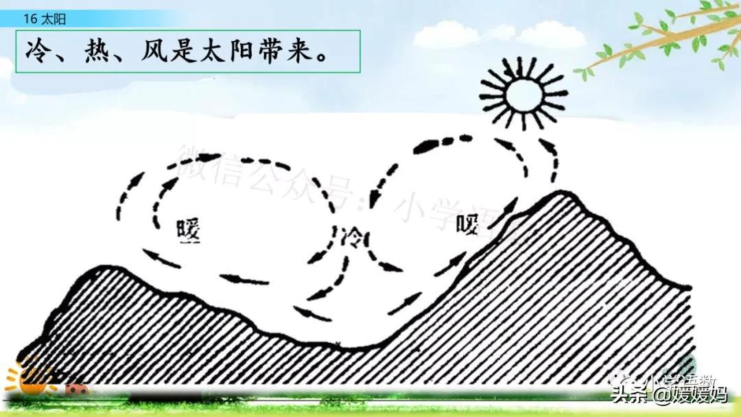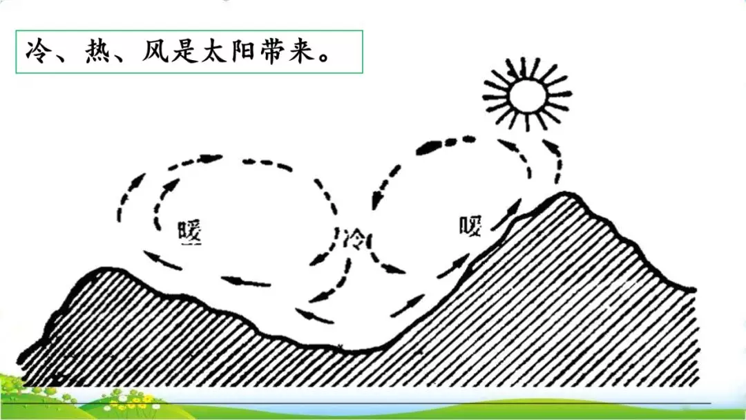 6、太阳晒着地面,有些地区吸收的热量多,那里的空气就比较热;有些地区吸收的热量少,那里的空气就比较冷。空气有冷有热,才能流动,成为风。