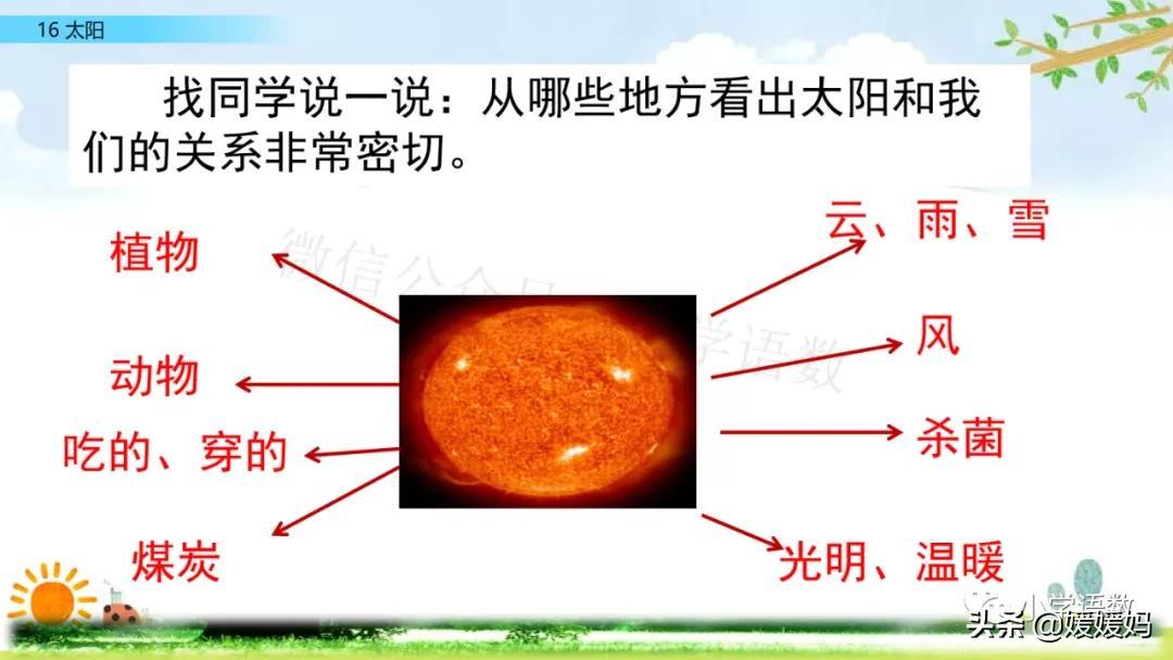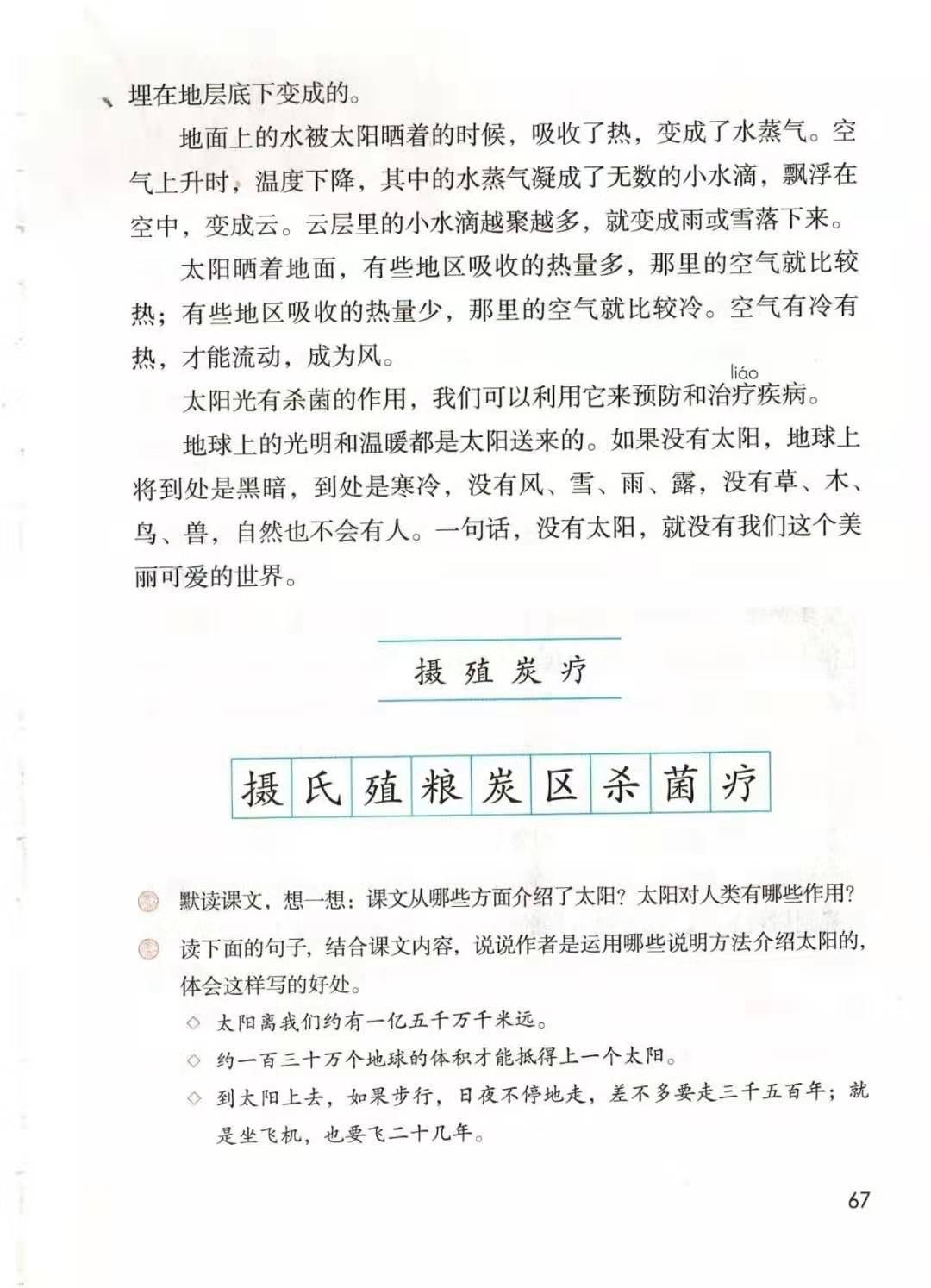 4、太阳虽然离我们很远很远,但是它和我们的关系非常密切。有了太阳,地球上的庄稼和树木才能发芽、长叶、开花、结果;鸟、兽、虫、鱼才能生存、繁殖。如果没有太阳,地球上就不会有植物,也不会有动物。我们吃的粮食、蔬菜、水果、肉类,穿的棉、麻、毛、丝,都和太阳有密切的关系。埋在地下的煤炭,看起来好像跟太阳没有关系,其实离开太阳也不能形成,因为煤炭是由远古时代的植物埋在地层底下变成的。