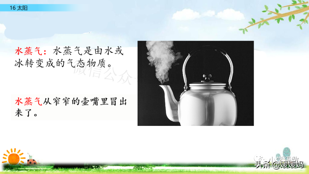 5、地面上的水被太阳晒着的时候,吸收了热,变成了水蒸气。空气上升时,温度下降,其中的水蒸气凝成了无数的小水滴,飘浮在空中,变成云。云层里的小水滴越聚越多,就变成雨或雪落下来。