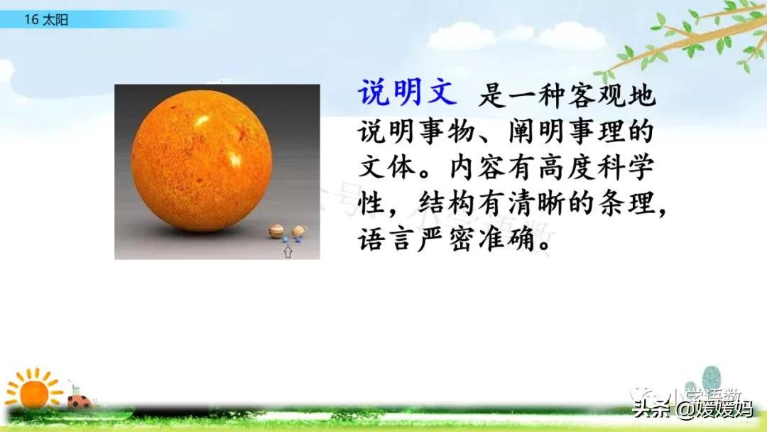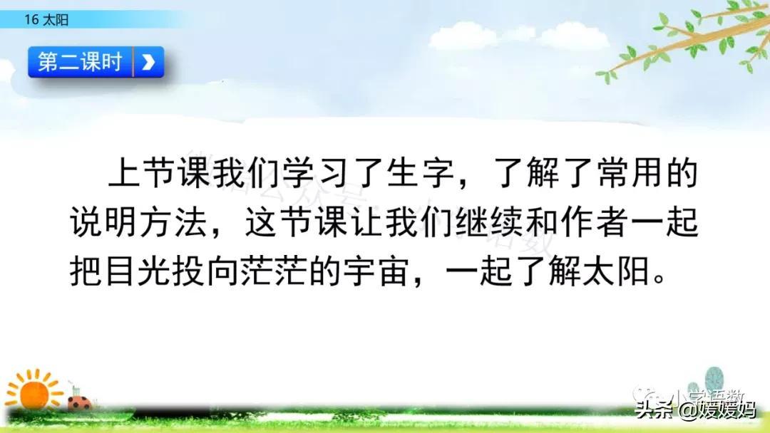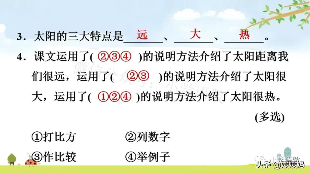 ③热:“太阳会发光,会发热,是个大火球。”这句话运用打比方的说明方法,把太阳热的特点生动地表现出来了。