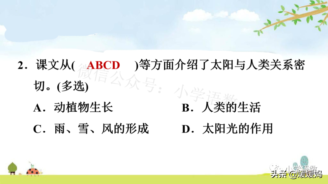 1.课文从哪些方面介绍了太阳?太阳对人类有哪些作用?