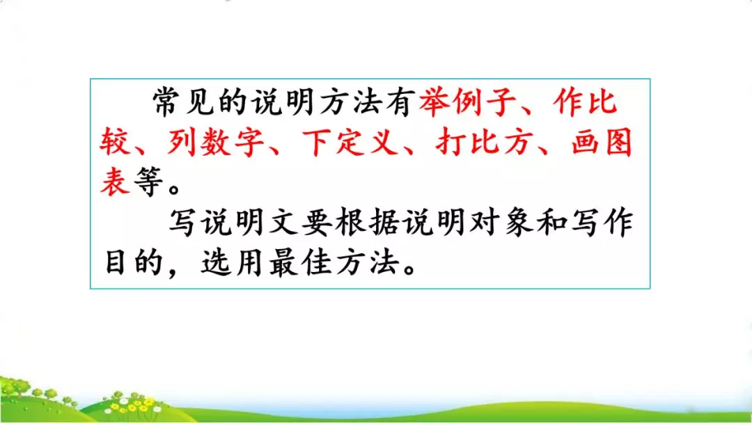 作比较:说明某些抽象的或者是人们比较陌生的事物,可以用具体的或者大家已经熟悉的事物和它比较,使读者通过比较得到具体而鲜明的印象。事物的特征也往往在比较中显现出来。