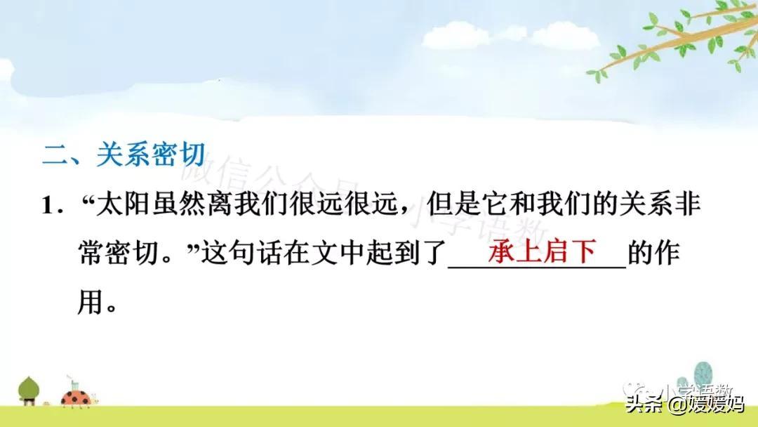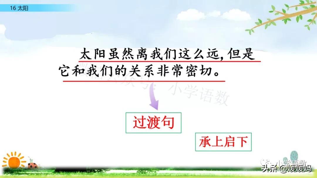 过渡句总结上文引起下文起到了承上启下的作用。提示我们前文讲的是太阳的有关知识,下面要讲太阳和人类的关系。