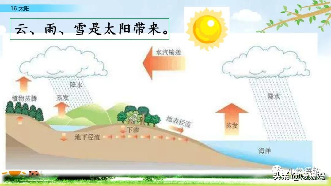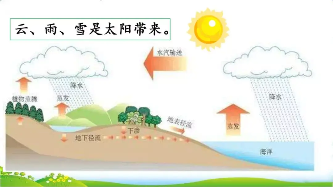 地面上的水被太阳晒着的时候,吸收了热,变成了水蒸气。水蒸气遇到冷,凝成了无数的小水滴,漂浮在空中,变成云。云层里的小水滴越聚(jǜ jù)越多,就变成雨或雪落下来。