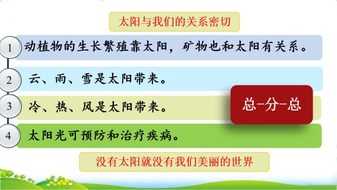 第一部分(第1~3自然段),分别从太阳距离地球远、体积大、温度高三个方面介绍了太阳。第二部分(第4~8自然段),介绍了太阳与动植物生长、能源形成、自然气候变化、预防和治疗疾病等方面的关系。这两部分内容联系紧密,正因为太阳距离地球远、体积大、温度高,才能给地球送来适合人类生存的光明和温暖。“太阳虽然离我们很远很远但是它和我们的关系非常密切“这个句子承上启下,将两部分内容有机结合在一起。课文从第4自然段开始写太阳和地球的密切关系,其中第4自然段讲两个主要信息太阳影响地球上动植物的生长,从而影响人类的生活;太阳还影响煤炭的形成。第5-6自然段主要讲太阳对气候的影响。第7自然段主要讲人类可以利用太阳光来杀菌,从而预防和治疗疾病。第8自然段用概括性的语言对这一部分进行总结。这样,太阳和地球的关系非常密切就让人信服了。课文结尾所说“一句话,没有太阳,就没有我们这个美丽可爱的世界”揭示了全文的主旨。