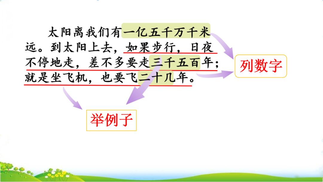 举例子、列数字“到太阳上去,如果步行,日夜不停地走,差不多要走三千五百年;就是坐飞机,也要飞二十几年。