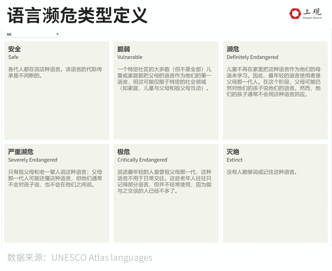 联合国教科文组织出版的《世界濒危语言地图集》显示,每两周就会有一种语言消失,这意味着每年会有25种语言消失,如果这种情况继续下去,将导致90%濒危语言彻底消失。