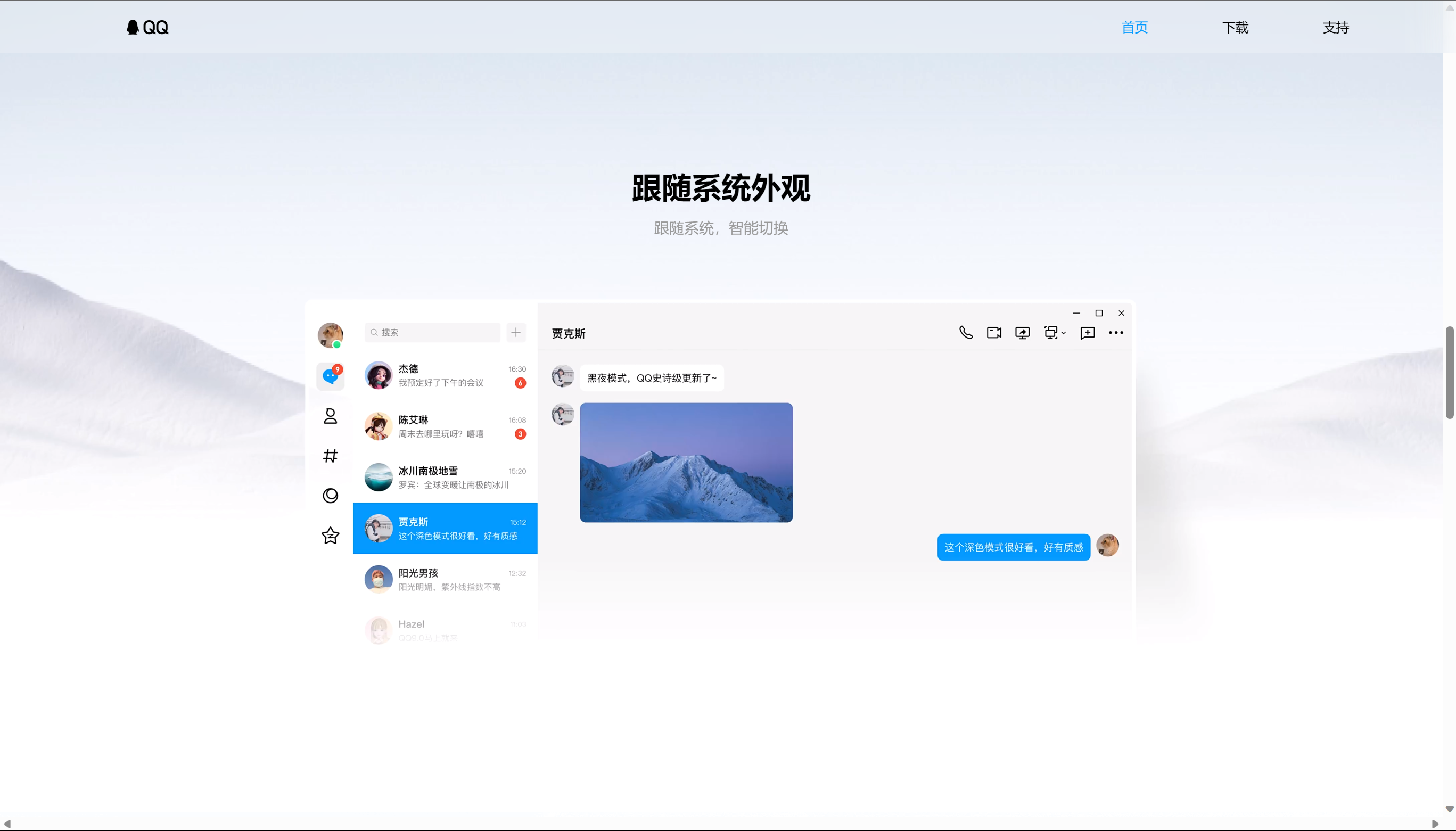 新版本的QQ支持了跟随系统外观智能切换白色和暗黑的两种背景,同时界面风格也一改过去祖传的经典界面,全新的交互界面使得整体风格简洁,美观。(个人认为比微信PC版还要好看)