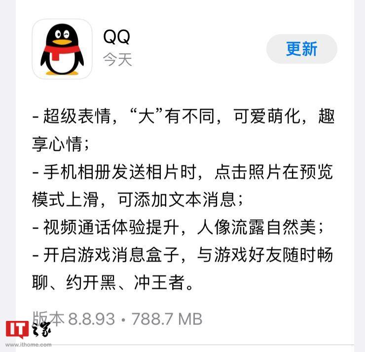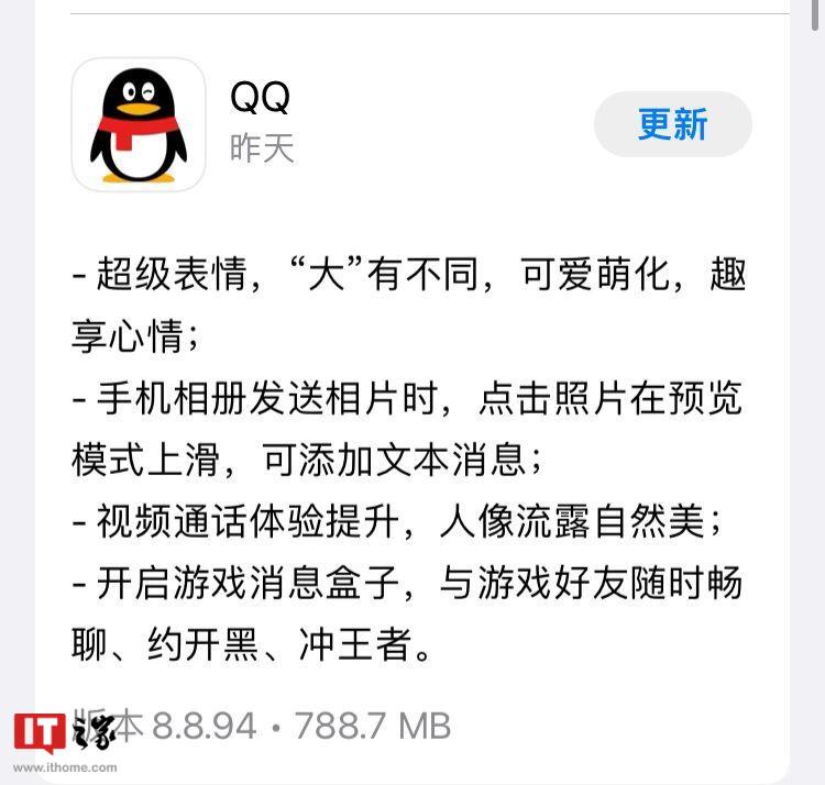 IT之家 6 月 4 日消息,近期,腾讯 QQ 团队发布了 QQ iOS 版 8.8.94 更新,需要注意的是,距离上次 8.8.93 更新,仅隔了 1 天,可能是修复了一些紧急 Bug。不过 QQ 官方并未给出具体的更新说明。下载包显示大小为 788.7MB,全新安装占用空间为 751MB。
